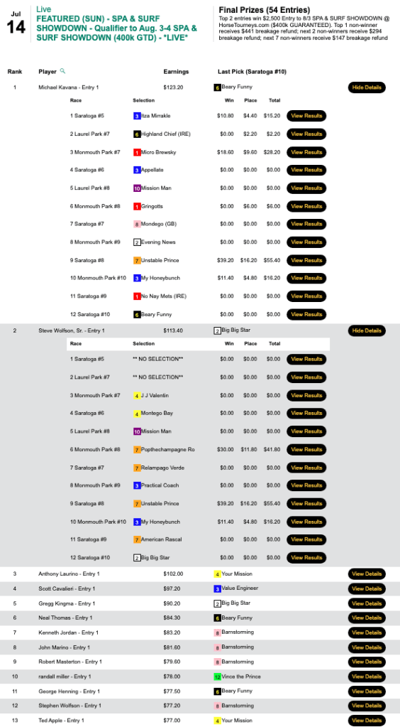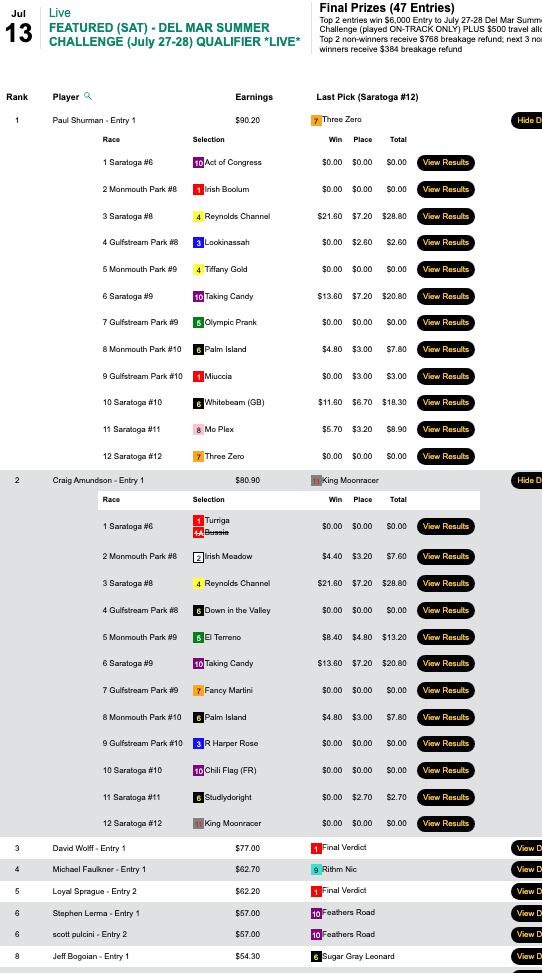Michael “Copa” Kavana’s 4 wins and 2 places led the way in Sunday’s Spa & Surf Showdown qualifier. Nothing notable to report here—just some fine handicapping, as we are used to seeing from Kavana.