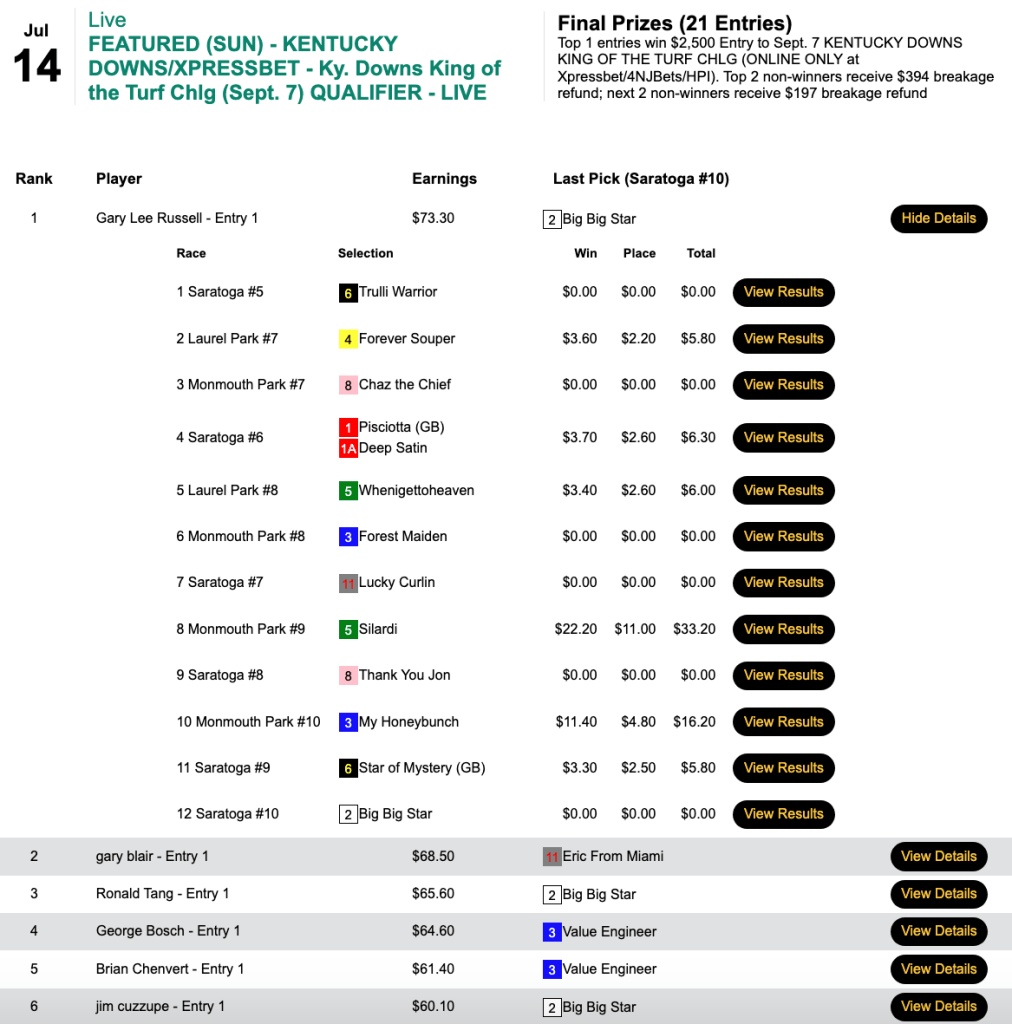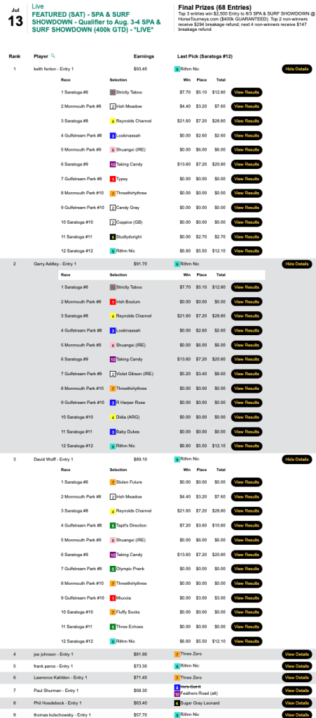 With 5 wins and 2 places here in this Live tourney, Wolff managed to get the third and final $2,500 seat for August 3-4. Finishing ahead of Wolff were Keith Fenton (5W, 3P) and Gerry Addley (5W, 2P). Fenton made collections in the first 6 contest races. All three of the seat winners had Reynolds Channel in their portfolios.