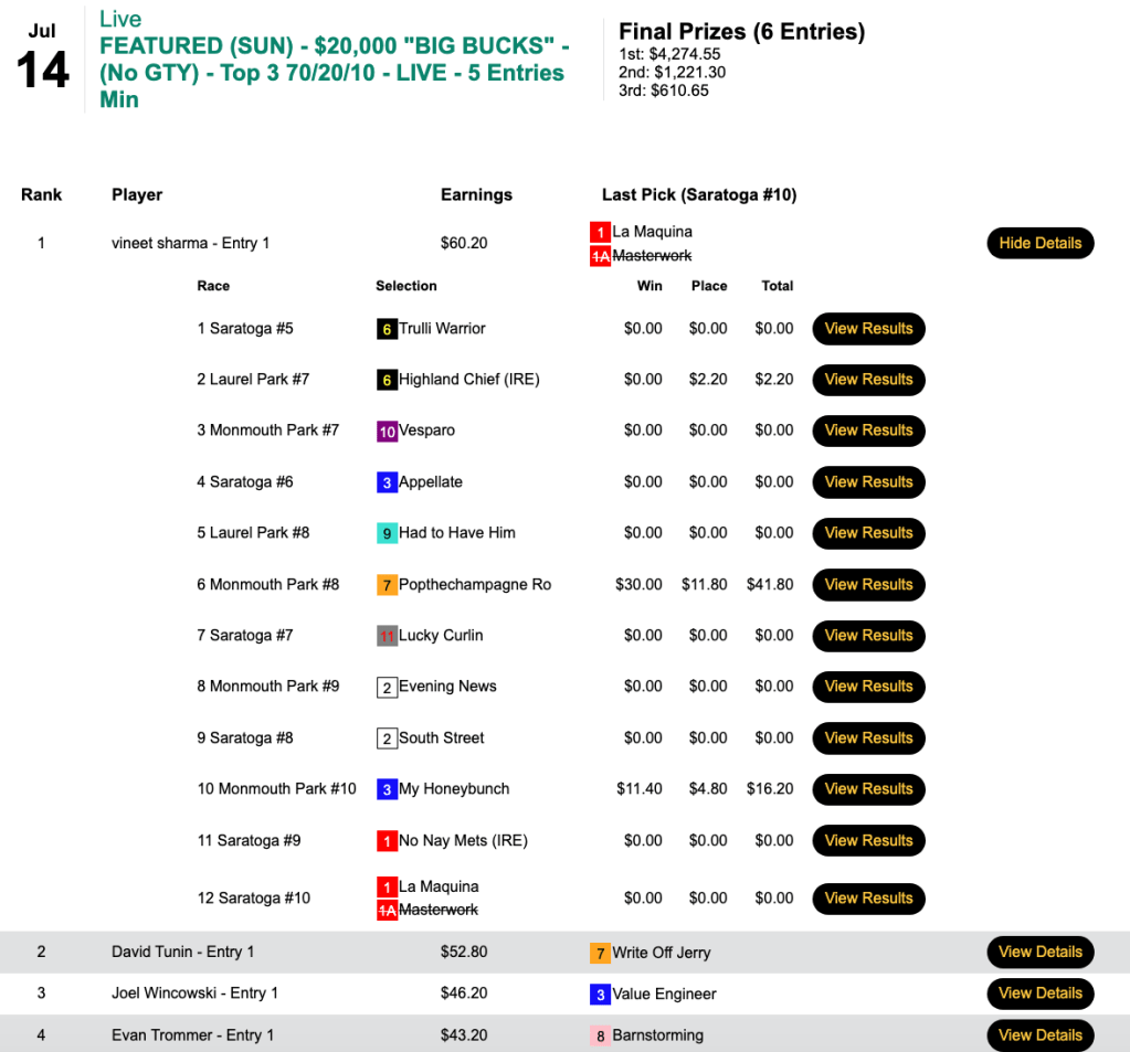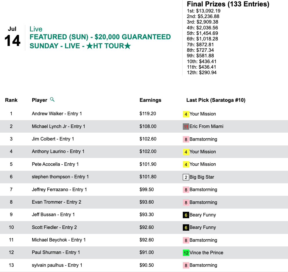 Paros finished second among four happy contestants in this game. The winner—with the highest score of the day ($104.70)—was G.T. Nixon who put up 7 wins and 3 placesand finished with. $31.00+ bulge over Paros. Elizabeth Canning (5W, 2P) and Jim Sebes (4W, 2P) completed the trifecta and superfecta, respectively.