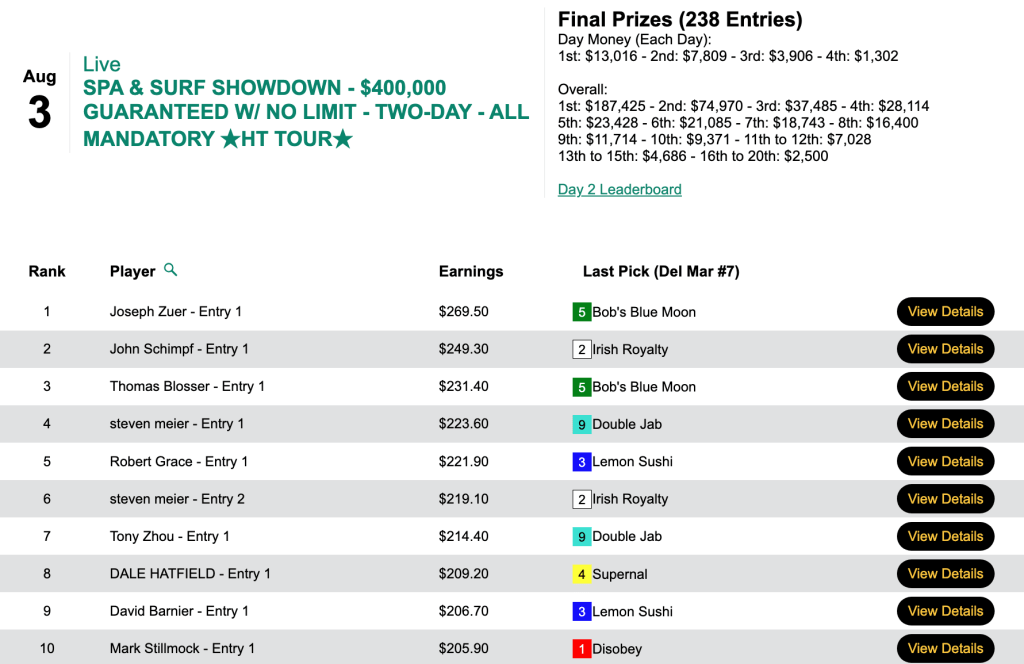 This year’s renewal—arguably the tightest, most exciting major in HorseTourneys history—had a field of 238 entrants and a total prize pool of $521,411. The $2,500-buy-in competition required players to make mythical $2.00 win-and-place selections on one horse in every race of the Saratoga and Del Mar cards on Saturday and Sunday, August 3-4.