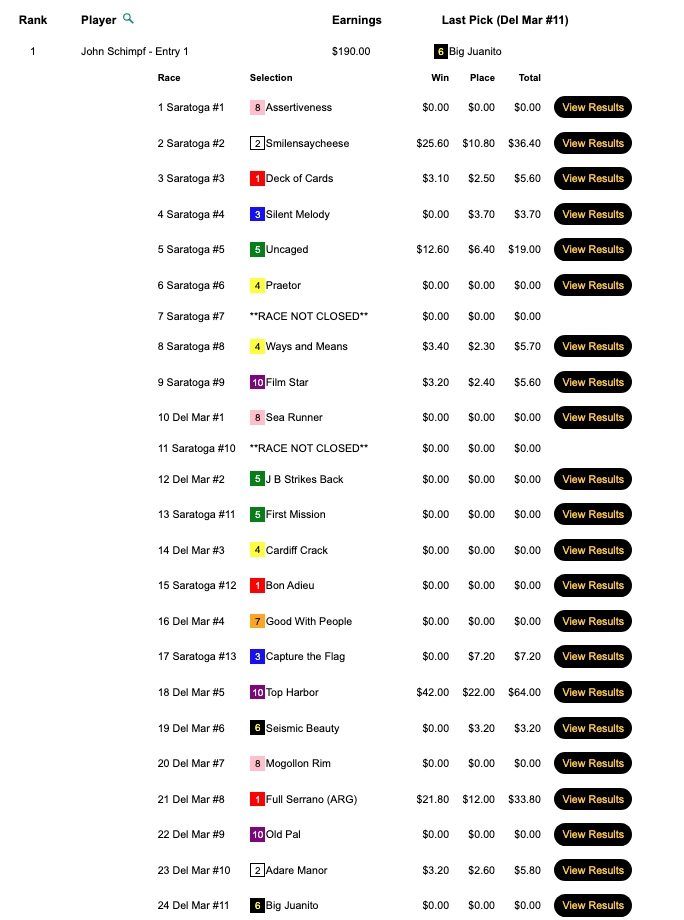When Pleasanton dirt-to-turfer Top Harbor captured the 5-furlong dash at odds of 42-1, it rocketed several players up the leaderboard—and Rich Constatine to the lead. Not too far behind him was fellow Top Harbor backer John Schimpf. And Steven Meier had Top Harbor on each of his two entries, putting him in the enviable position of occupying both 3rd and 5th places.