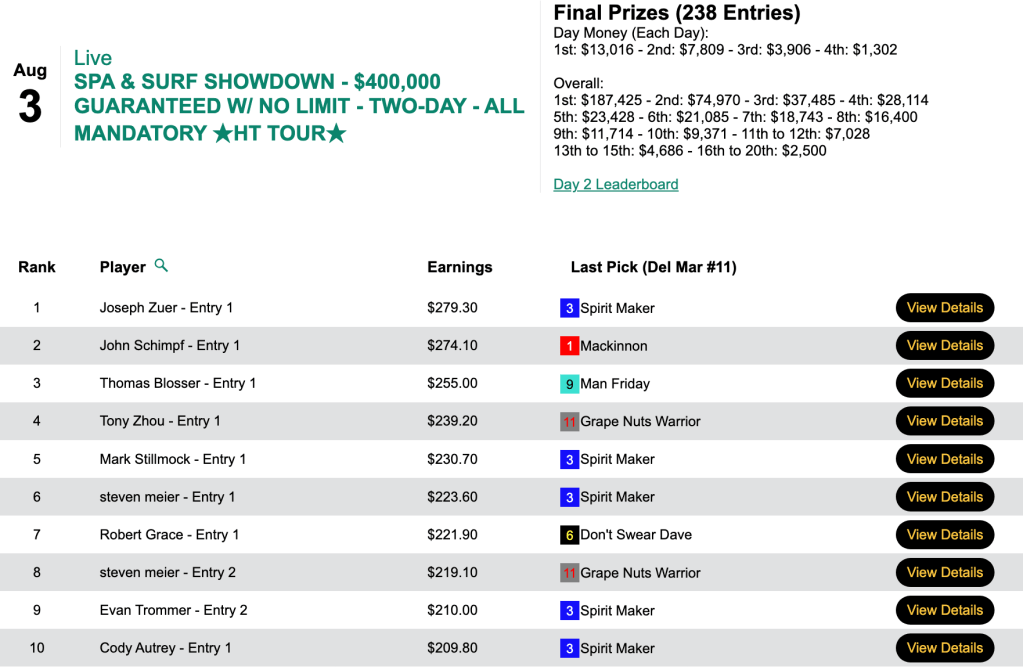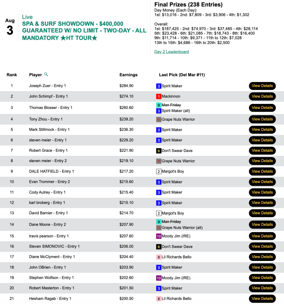 Schimpf wasn’t done fighting, though. He nailed Ricks Red Storm ($21.60, $8.60) in the 6th at Del Mar to regain the lead. Joseph Zuer—still plugging away after concluding Day 1 in 6th place—also used Ricks Red Storm, and now Zuer was in 2nd, just $6.80 behind Schimpf.