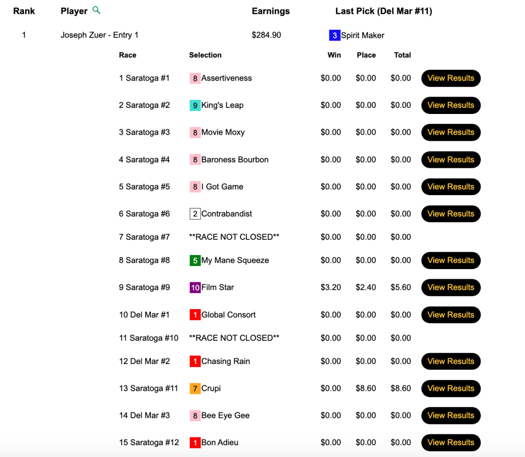 What a competition. Contests aren’t always exciting at the end, but this one was. Starting with race 7 at Del Mar, Zuer and Schimpf exchanged the lead amongst themselves three times in a four-race span. And throughout all of that, many others were well within winning range had their horses come in.