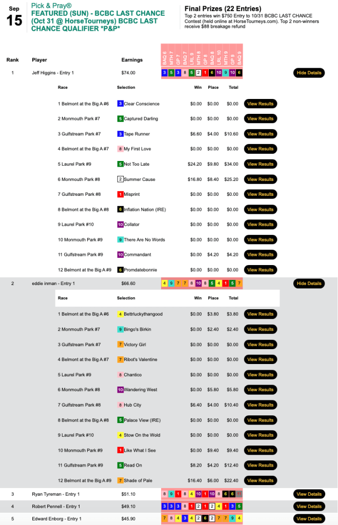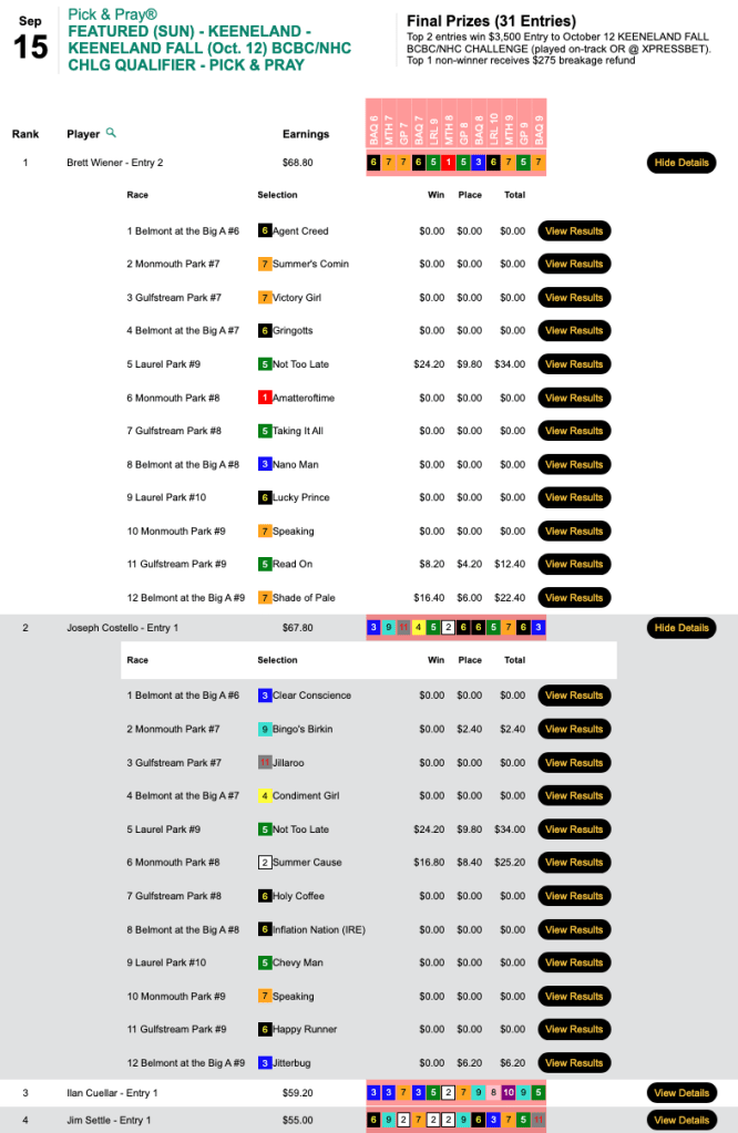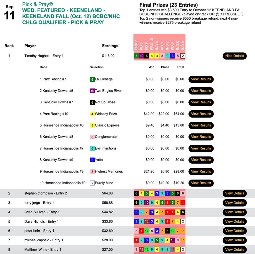 Rewinding back to Wednesday, the 2022 Spa & Surf Showdown champion Tim Hughes led the way in our Keeneland Fall BCBC/NHC Challenge play-in.