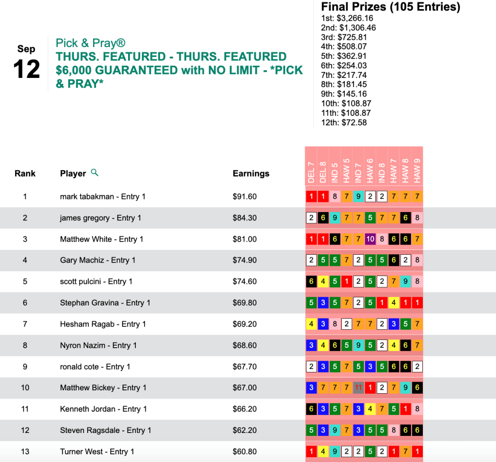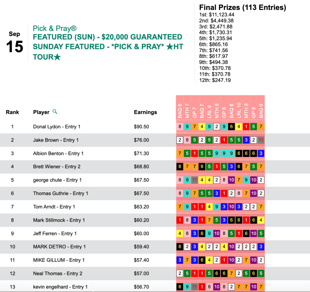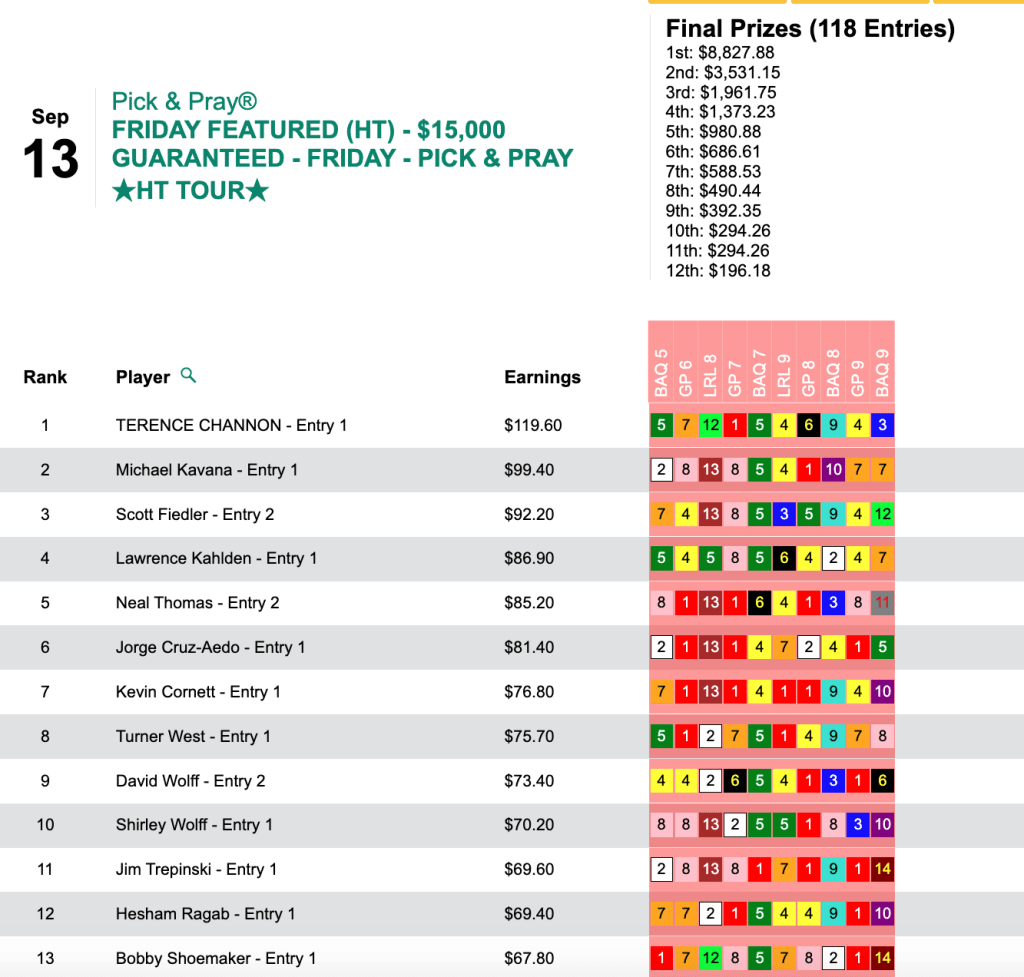 Winning seats is always great but immediate gratification in the form of cold, hard cash is obviously the end-game for all of us, and that’s what Channon did it Friday’s HT Tour game, our $15,000 Gtd. Pick & Pray, which was ultimately worth a total of $19,617. Channon’s share of that was $8,827.