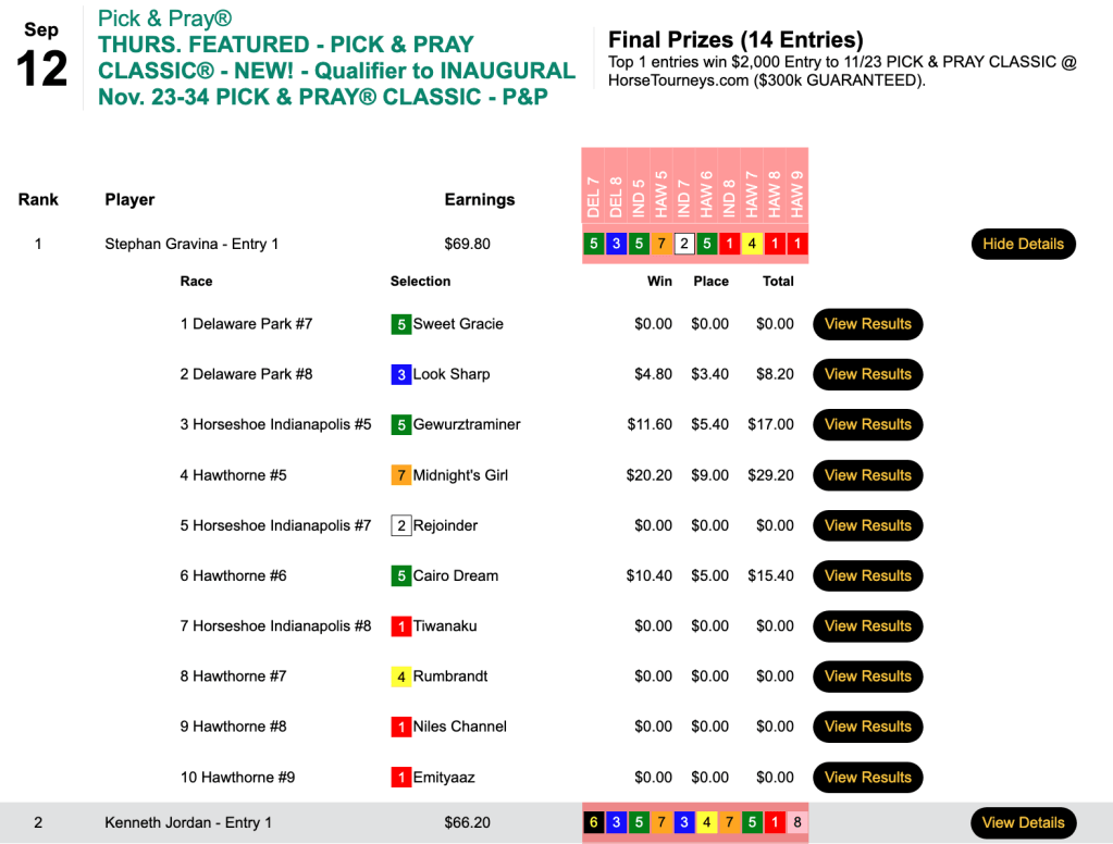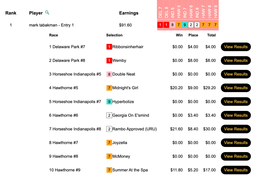 Mark “Santana” Tabakman (3 wins, 3 places) grabbed the winner’s share of $3,266 in Thursday’s $6,000 Gtd. Pick & Pray, which closed with a purse of $7,258. Tabakman prospered with a selection that was Rambo Approved in the 8th at Horseshoe Indianapolis. Actually, that was the name of the horse—Rambo Approved ($21.60, $8.40). A few races earlier, Tabakman drew first blood with Midnight’s Girl ($20.20, $9.00) in the 5th at Hawthorne.