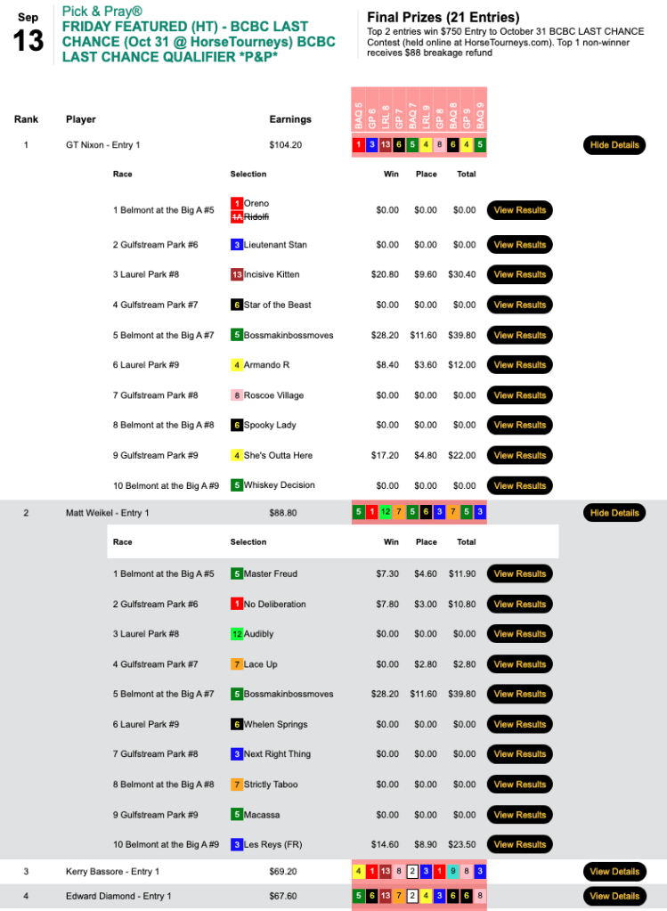 The most lucrative of the four came in Friday’s Breeders’ Cup Betting Challenge Low Ratio qualifier at HorsePlayers.