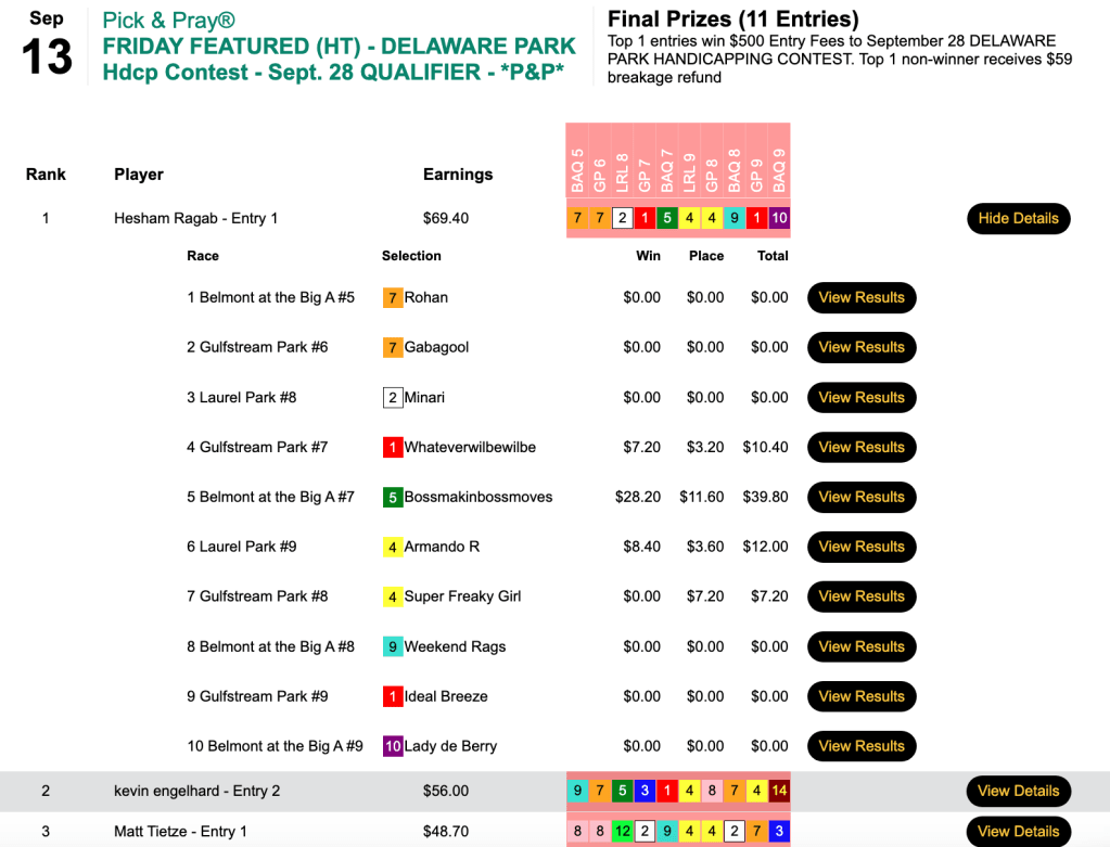 …chalk up another tourney victory for the ultra consistent Hesham Ragab. He had 3 straight winners including Bossmakinbossmoves, and also added one runner up, to earn a $500 seat in the September 28 Delaware Park Handicapping Contest.