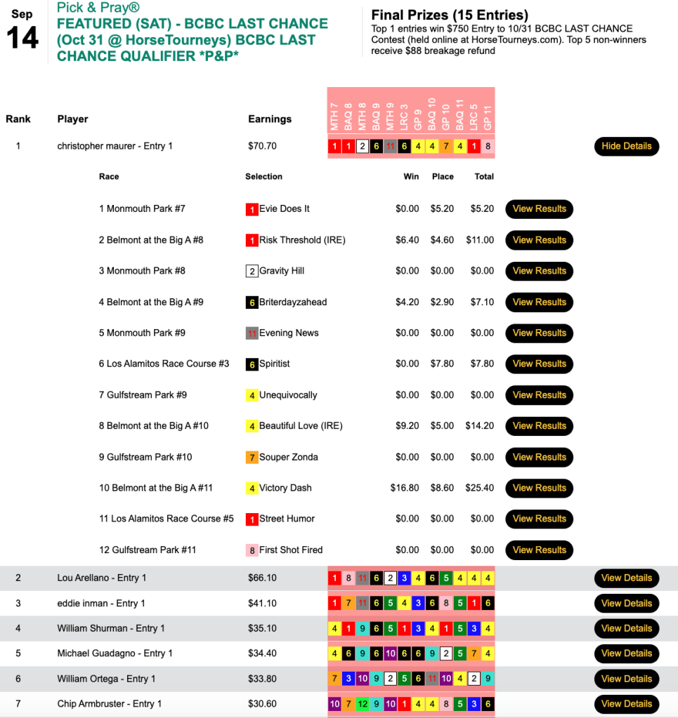 David Barnier (4 firsts, 1 second) had Kate’s Cuban Kiss early on, and later he correctly predicted the outcome of the final two contest races to bag the $11,503 grand prize in Saturday’s $25,000 Gtd. Pick & Pray (an HT Tour event). The final prize pool here was $25,564.