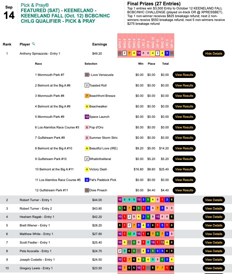 That would be Anthony Spinazzola—who blanked on the first 7 contest races before recording 2 wins and 2 places over the final 5 heats. That got him a total of $49.20 and the $3,500 Keeneland berth. His best pick was Victory Dash ($16.80, $8.60) in race 11 at BAQ.