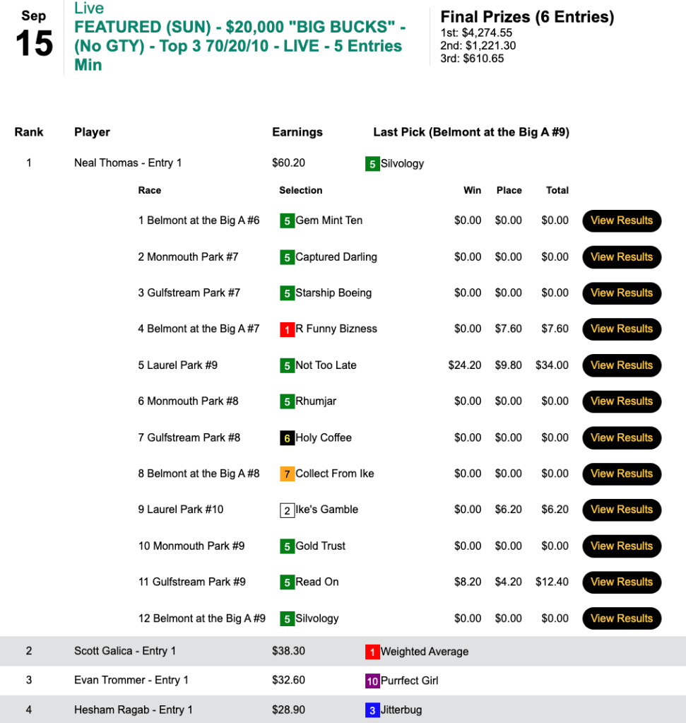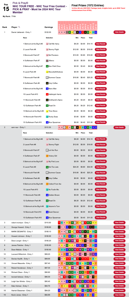 Leading the large pack of 1,572 entrants was Daniel Jablanski. Contrary to popular belief, you don’t necessarily have to nail the day’s three biggest prices in one of these to succeed. In fact, Jablanski didn’t even have the day’s highest priced winner—Not Too Late ($24.20, $9.80) in the 9th at Laurel. Jablanski compensated for that omission, however, by firing off 9 winners in 15 races. The other three free-seat winners did all include Not Too Late in their picks. Congratulations to Sam “Hear Me” Raur (6 wins, 0 places), Bob McIntyre (4W, 2P) and George Howard (5W, 2P).