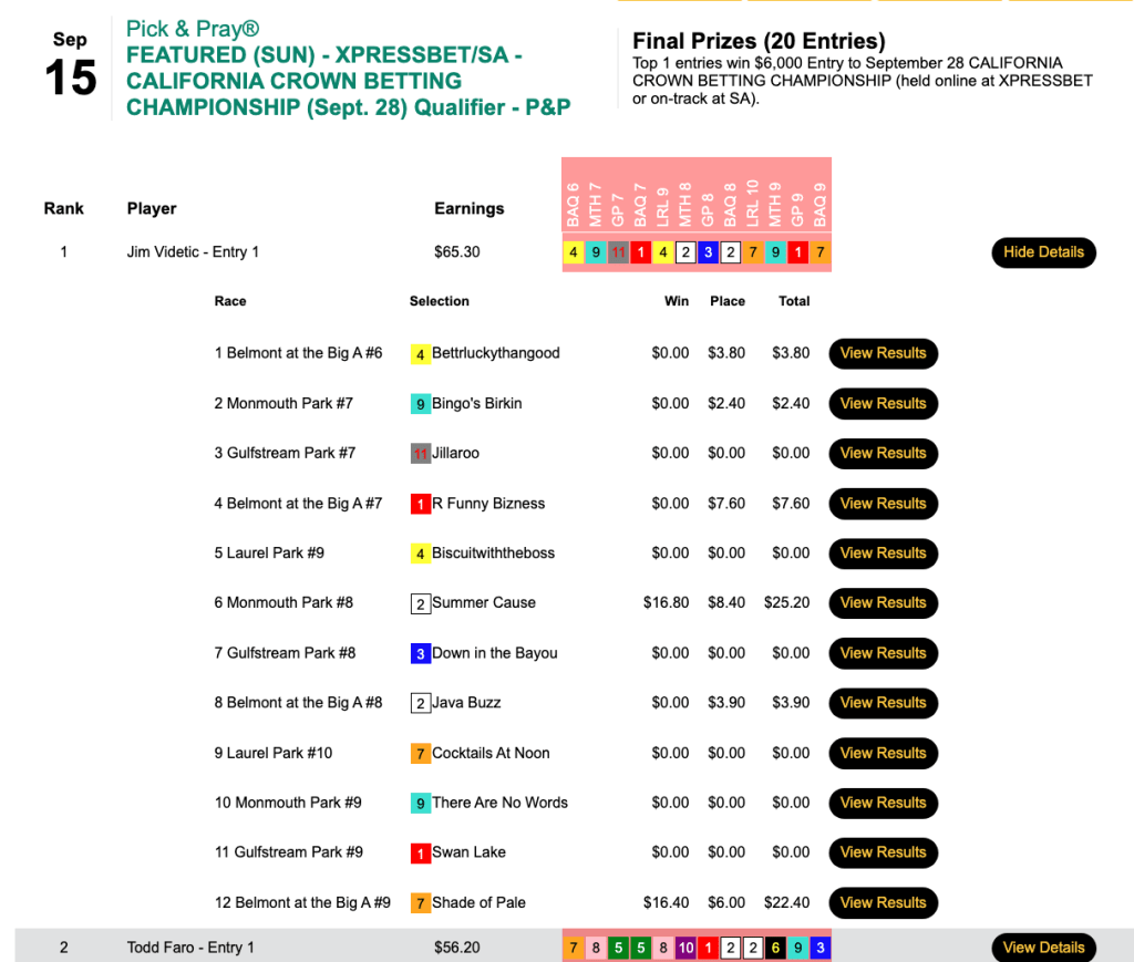 Taracks (2 wins, 2 places) won a $2,000 seat to the $300,000 Gtd. Pick & Pray Classic, while Thomas (also 2W, 2P) collected $4,274 for finishing first in Sunday’s $6,176 Big Bucks tourney.