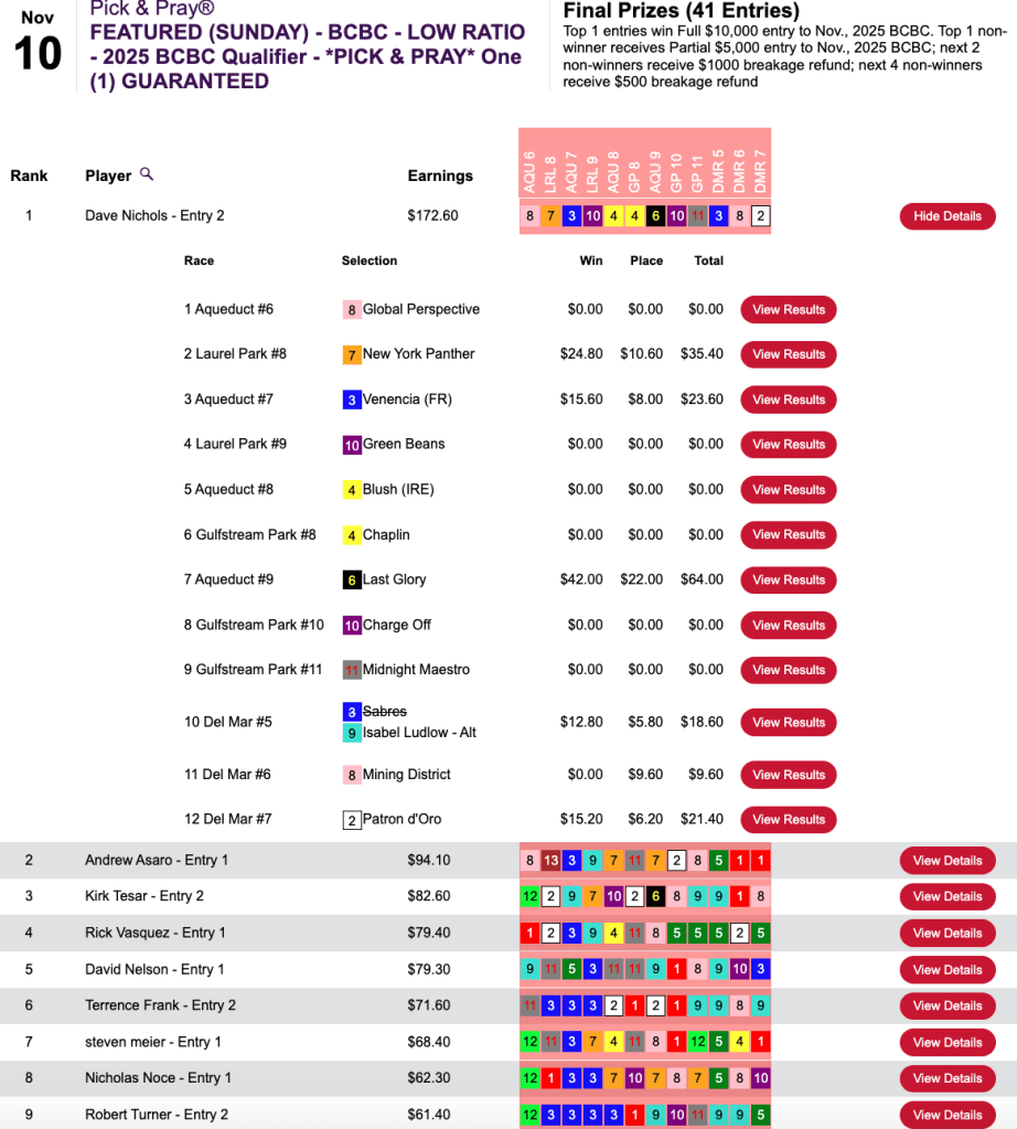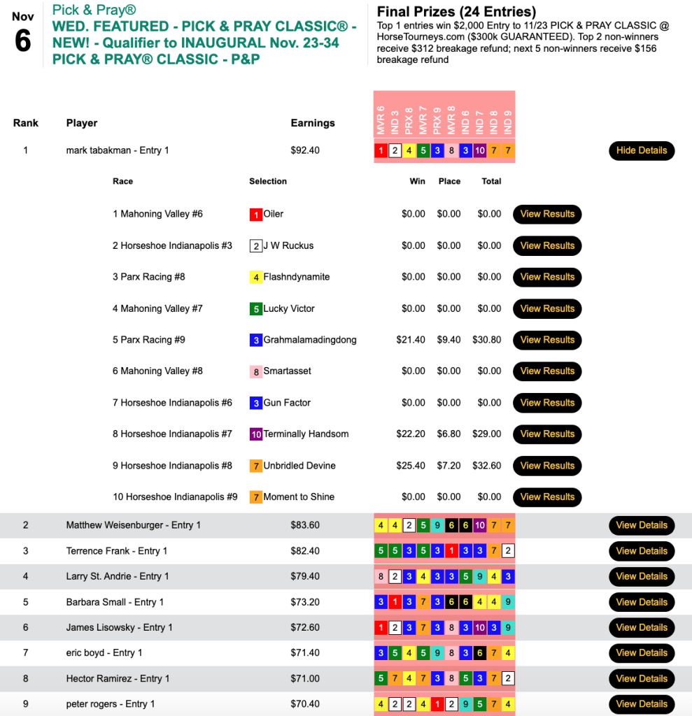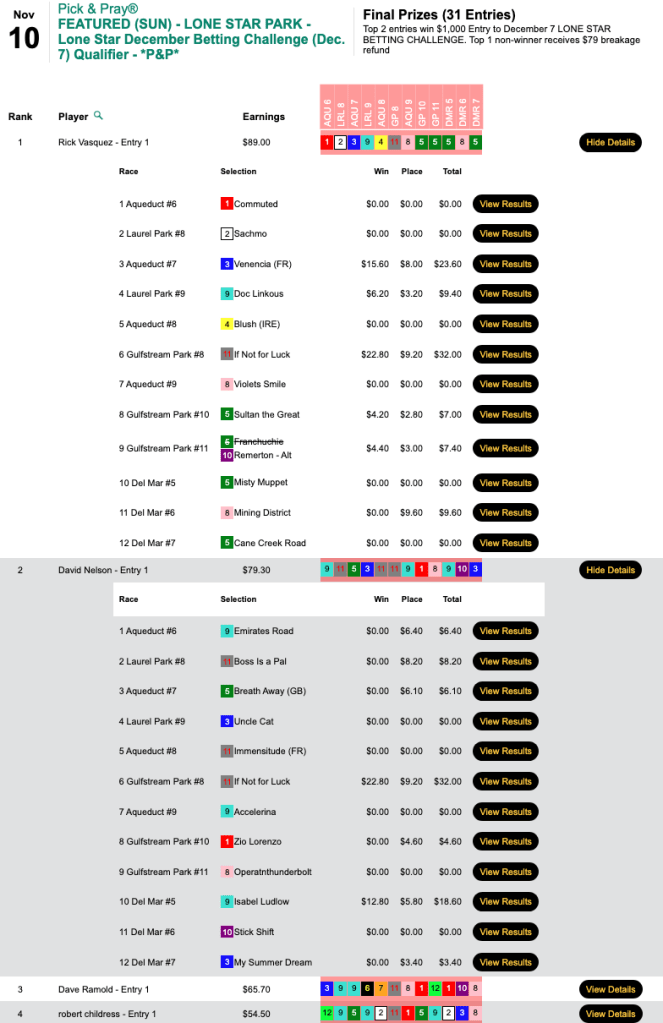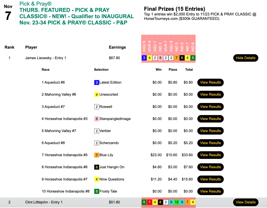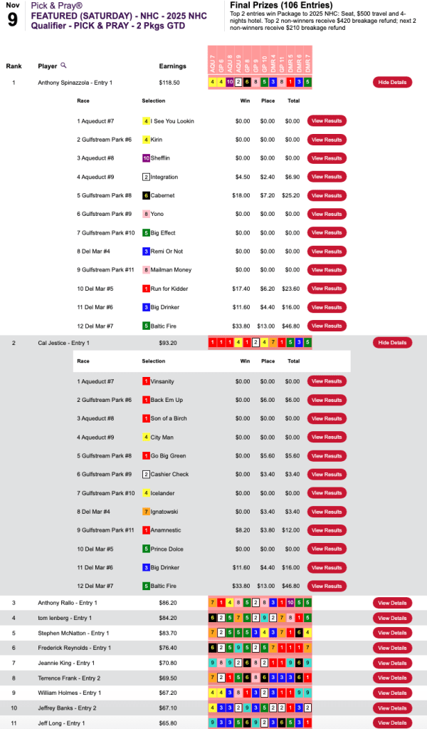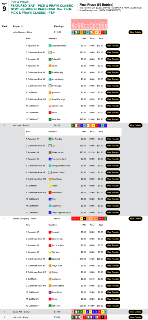 Employing identical picks, Gencius also finished first in Saturday’s Pick & Pray Classic qualifier, which awarded four $2,000 places in the November 23-24 extravaganza right here at HorseTourneys.