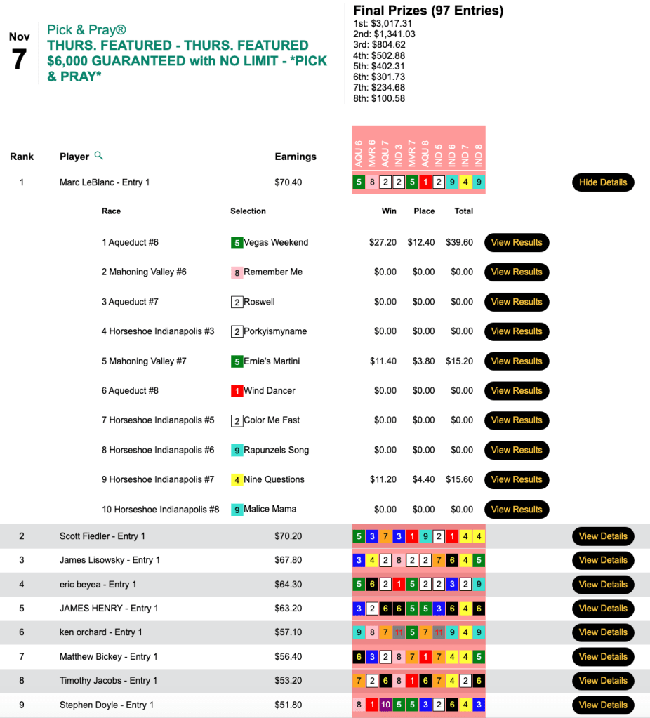 This LeBlanc’s friends were three horses that won for him…most notably Vegas Weekend ($27.10, $12.40) in the first contest race, the 6th at Aqueduct. His winner’s share came to $3,017 in a tourney that was ultimately worth a total of $6,705.