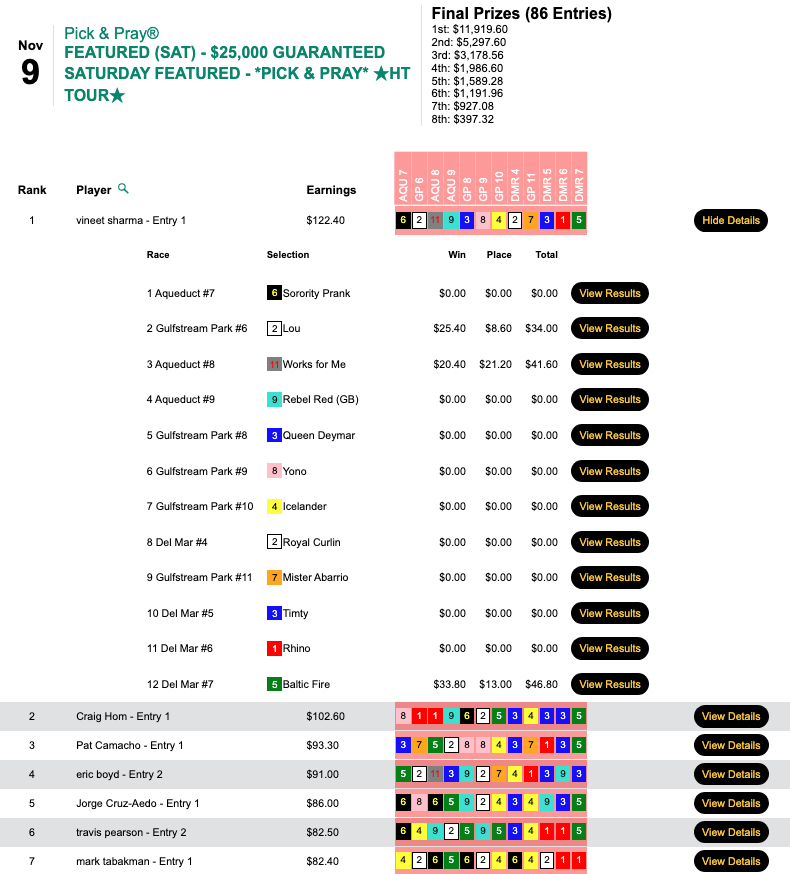 Birds in the bush are always nice, but Sharma clearly prefers birds in the hand. In the final contest race (the 7th at Del Mar), he connected with Baltic Fire ($33.80, $13.00). That gave Sharma three winners on the day and a victory worth $11,919 in our richest tourney of the week, our $25,000 Gtd. Pick & Pray (an HT Tour event), which closed with a final prize pool of $26,482.