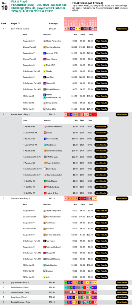 Nichols and Asaro (4 consecutive winners) ran one-two in Sunday’s qualifier to the Del Mar Fall Challenge. And since this was a “three seater,” they each emerged with $3,000 entries for November 30…as did Stephen “Chile con” Caso (3 wins, 0 places), who came in third.