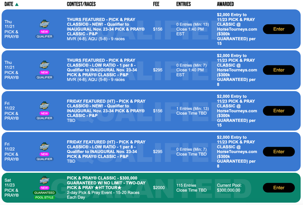 For those who are already signed up and who wish to get a head start on their handicapping, the Day 1 Pick & Pray Classic races will be the 7th through 9th from Aqueduct, races 6 through 9 at Tampa Bay Downs, the 7th through 11th from Gulfstream and races 1, 3, 4, 5, 6, 7, 8 and 9 at Del Mar. That’s 20 races in all for Saturday with the first of them, race 7 at Aqueduct, slated to break from the gates at 3:08 pm ET.