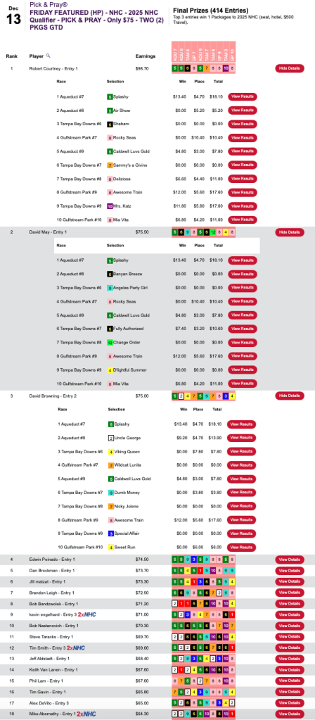 Courtney finished first in a very tight $75 NHC qualifier at HorsePlayers, which wound up awarding three Vegas berths. The other two went to David May (5W, 1P) and David Browning (4W, 3P). All three winners got off to fast beginnings thanks to Splashy ($13.40, $4.70) in the first contest heat, race 7 at Aqueduct.