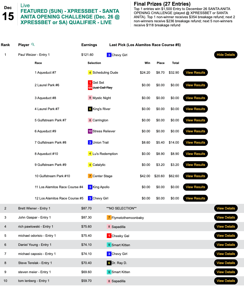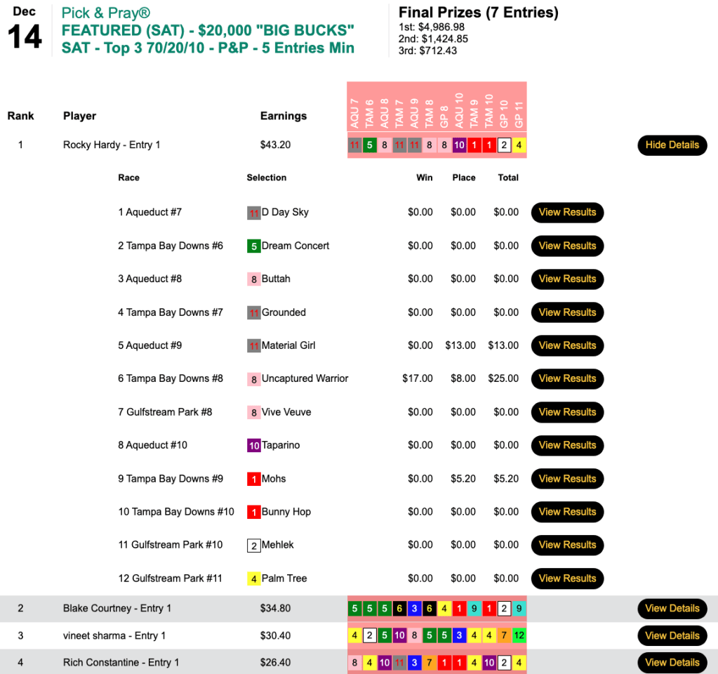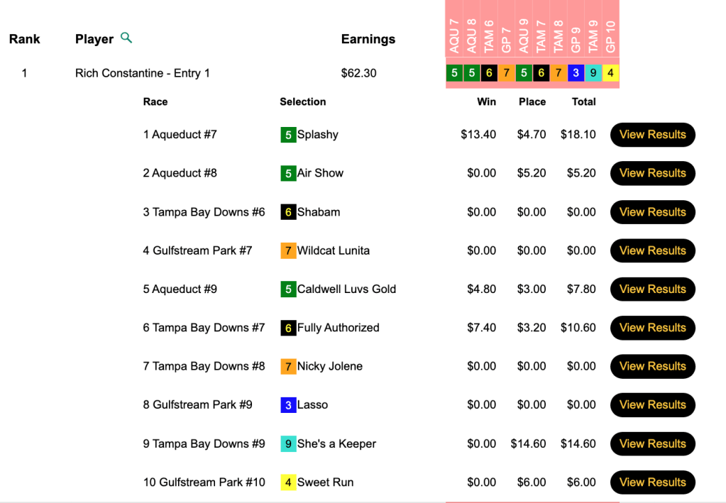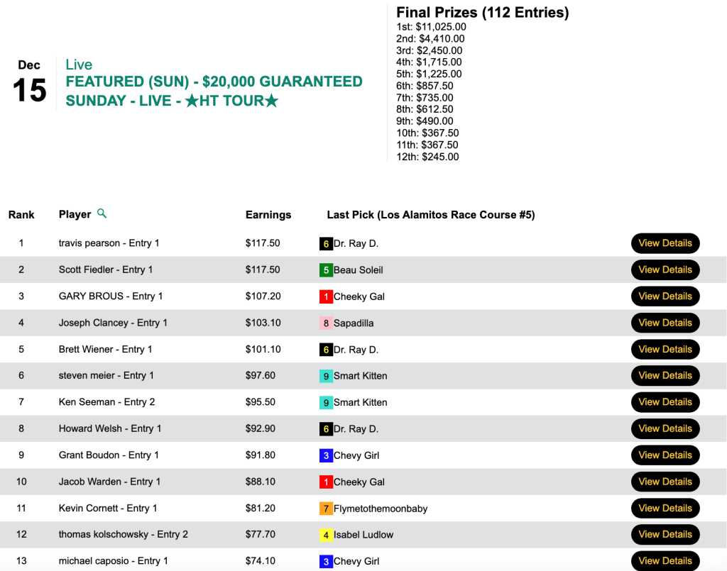 Constantine hit two nice place payoffs at the end, which got him over the top by $1.20 in Friday’s HT Tour event, our $15,000 Gtd. Pick & Pray, which closed with a final purse of $18,453. Constantine’s share of that came to $8,304.