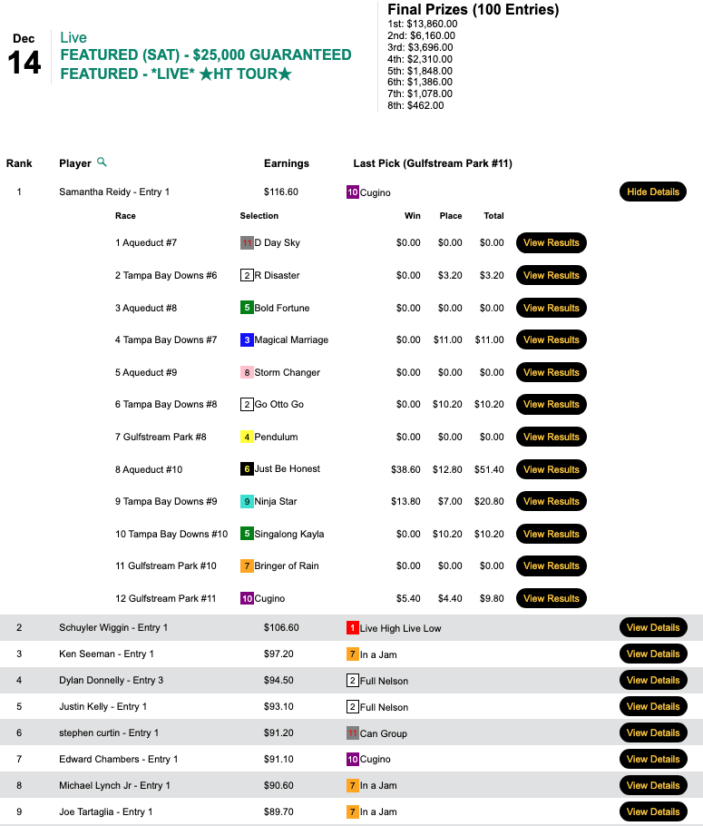 Reidy (3 wins, 4 places) strutted her stuff at HorseTourneys, not HorsePlayers, but she had a day-best score that was 30 cents higher than Long’s to take the richest competition of the week, our $25,000 Guaranteed cash game. She, too, hit Just Be Honest and emerged victorious by $10.00 over Schuyler Wiggin with Ken Seeman winding up third. The victory by Reidy was worth $13,860 in an HT Tour battle that ultimately paid out a total of $30,800.