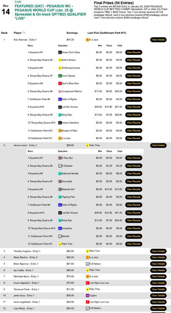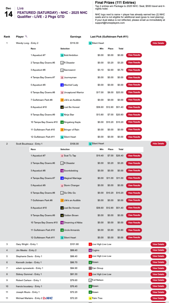 Long put up 4 winners—including 18-1 Just Be Honest at Aqueduct—and 2 runners up to take the top spot in Saturday’s $165 NHC qualifier at HorsePlayers. Scott Boudreaux (2 wins, 4 places) also had Just Be Honest, and he finished closest to Long to earn the other NHC spot up for grabs.