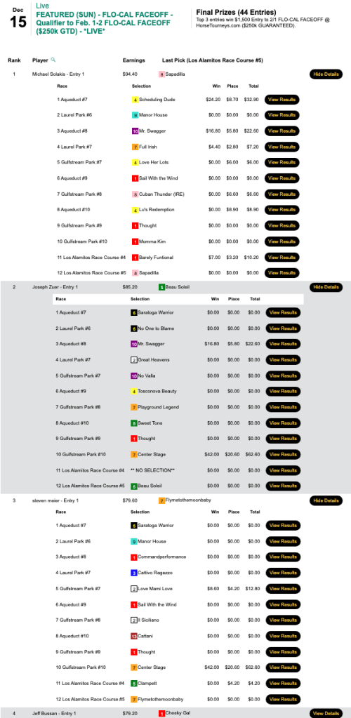 Meier didn’t do so by much, holding 3rd-place and completing his $9,500 weekend by a mere 40 cents in this three-seat qualifier. Ahead of Meier were this year’s Flo-Cal Faceoff champ Michael Solakis (who can now defend his title in February via a “freeroll”) and Joseph Zuer. Like Meier, Zuer connected with Center Stage. The heavy lifter for Solakis was Scheduling Dude ($24.20, $8.70) in race 7 at Aqueduct.