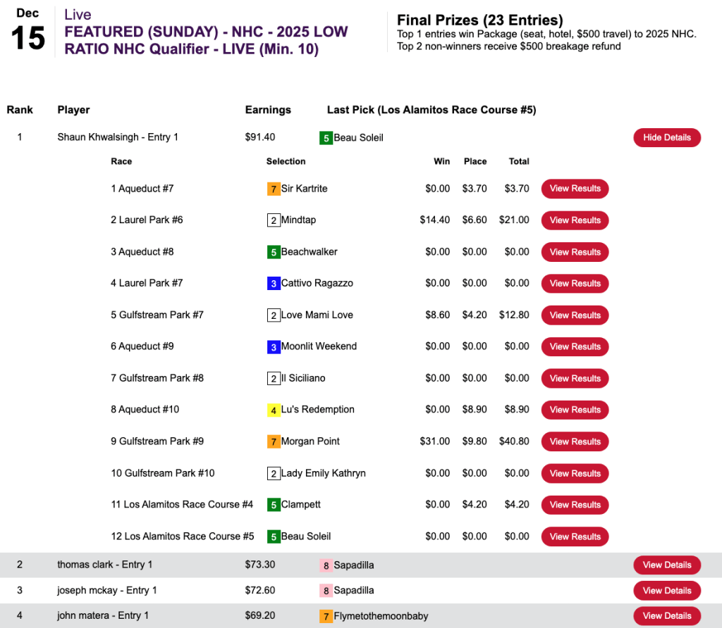 There was also an NHC qualifier — a Low Ratio affair — on Sunday at HorsePlayers.