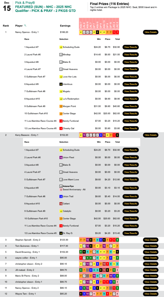 Spence ($186.20) and Kerry Bassore ($152.20 built on 6W & 2P) had what were, by far, the two highest scores of the day, and they each played their way to Vegas in Sunday’s $165 NHC Pick & Pray here at HorseTourneys. Bassore got up for 2nd thanks to sweeping the final three contest heats, starting with Center Stage in the 10th at Gulfstream.