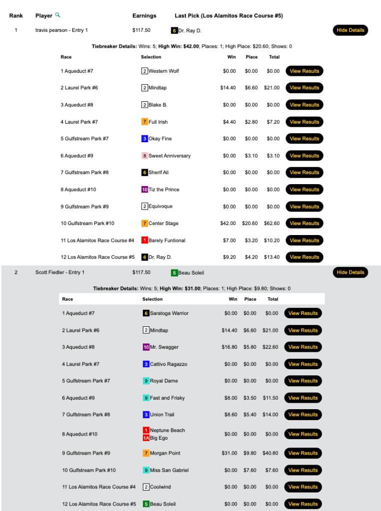The nod—and, more importantly, the $11,015 winner’s share—went to Pearson, however, because his biggest winner, Center Stage ($42.00 for contest purposes) was bigger than Fiedler’s biggest (Morgan Point, $31.00). Fiedler had to settle for $4,410 in a game whose final prize pool was $24,500.