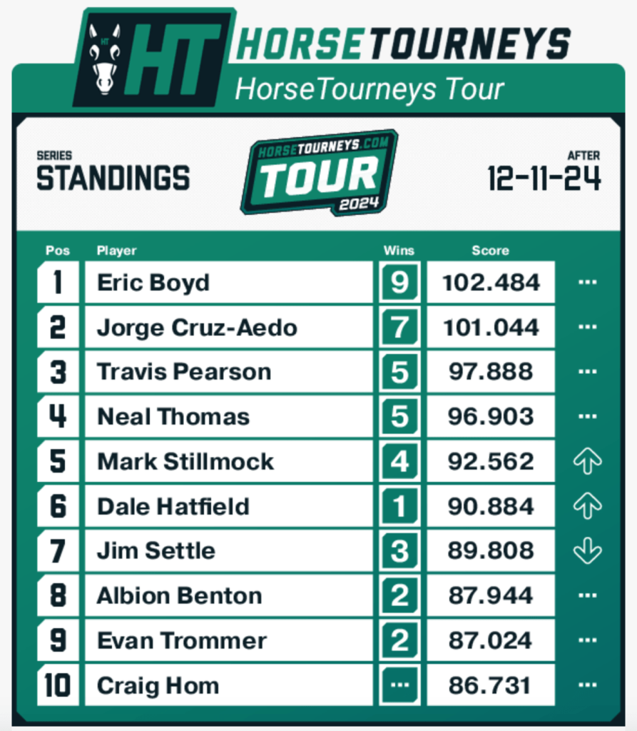 Our 2022 HorseTourneys champ Travis Pearson will make things even closer on Eric “B Connected” Boyd and Jorge Cruz-Aedo once the leaderboard has been updated. Speaking of close, wins don’t get any closer than the one Pearson enjoyed in this $20,000 Guaranteed test. He and 2020 Spa & Surf Showdown champ Scott Fiedler finished the 12 races dead even, and both had 5 wins and 1 place.