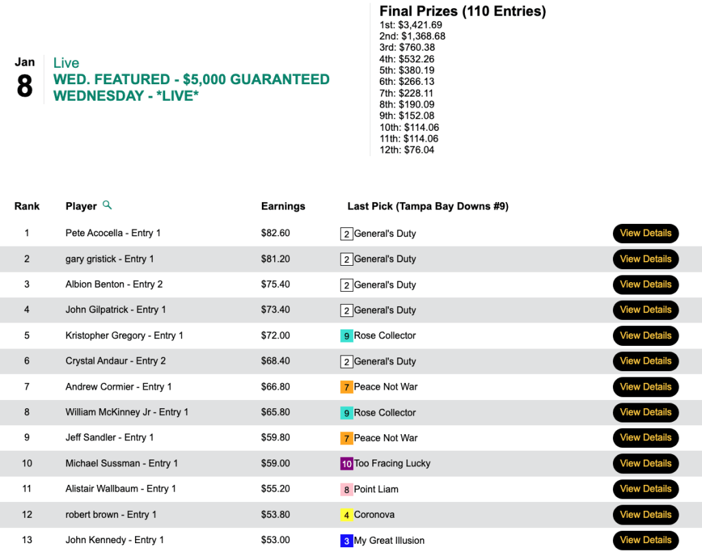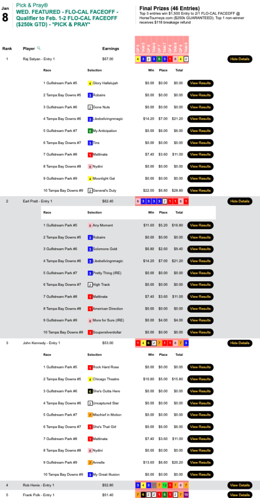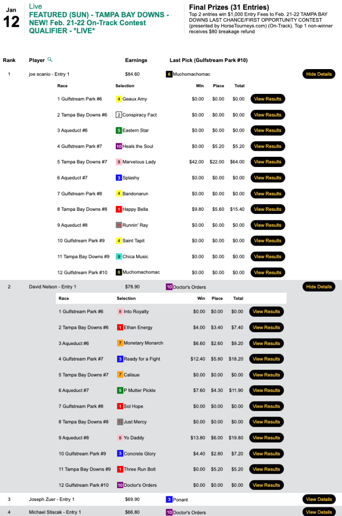 This time there were enough entries attracted for two entries to be awarded. The other one went to runner up Matthew Blanchet (5W, 0P). Rumfolo and Blanchet each doped out the big cap horse of the day—Marvelous Lady ($60.80, $22.00) in race 7 at Tampa Bay Downs.