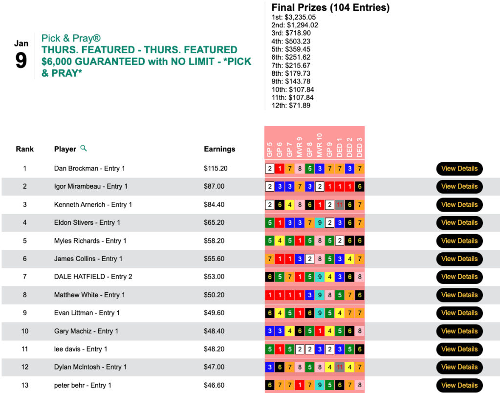 An even tighter battle was Friday’s HT Tour event, our $15,000 Gtd. Pick & Pray, which paid out a total of $20,116.