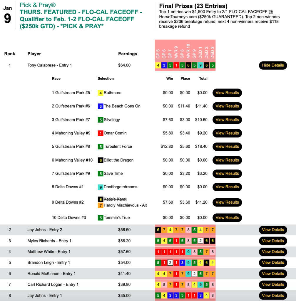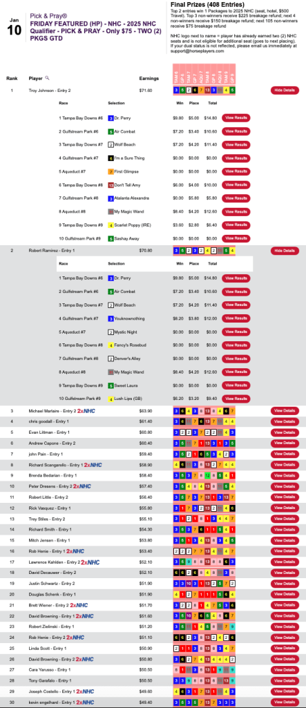 The bar to clear in Friday’s $75 NHC qualifier at HorsePlayers was $70.00, and Troy Johnson and Rob “Irish Angel” Ramirez each utilized 6 winners to reach that height.