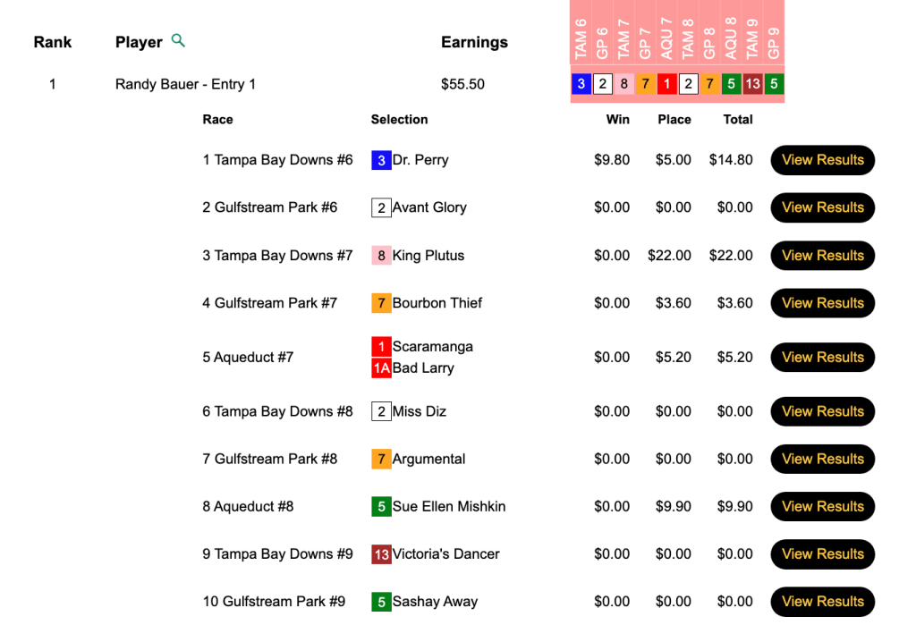 By a margin of 50 cents, Randy Bauer (1 win, 4 places) made off with the up-top money of $9,052. Bauer’s big winner was one of his “losers”—King Plutus, a 73-1 shot that provided Bauer with a max $22.00 place return for his runner-up finish in the 7th at Tampa.