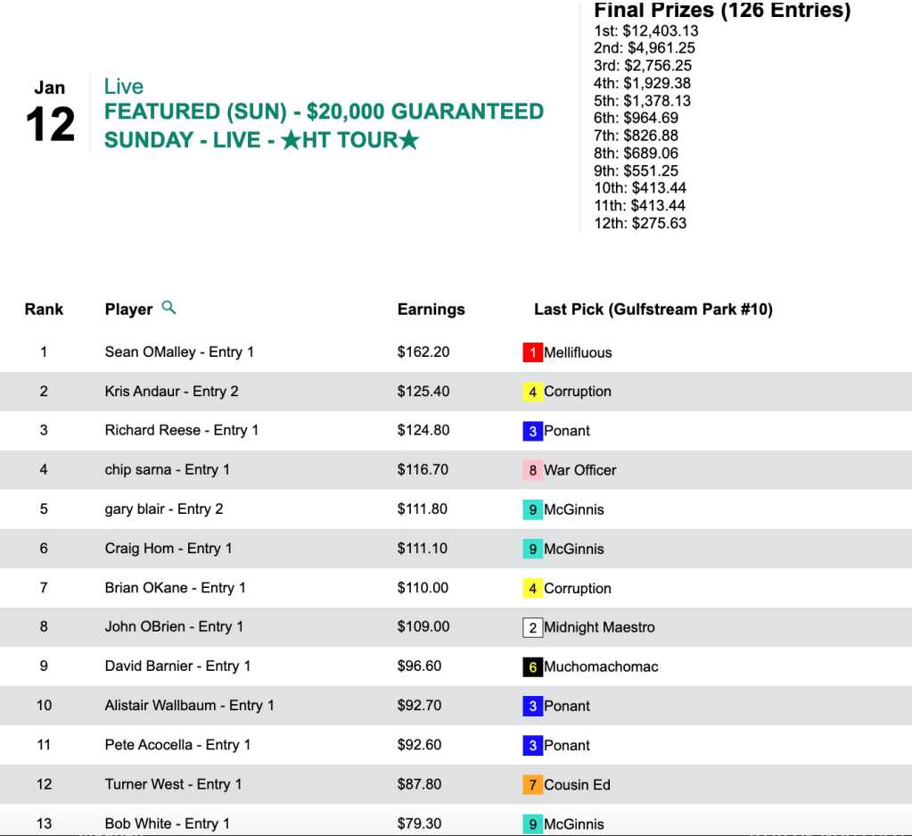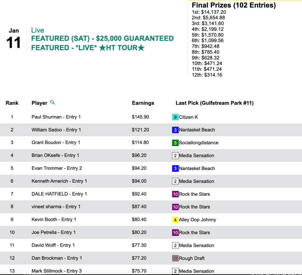 Shurman pocketed $14,137 in our richest tourney of the week, our $25,000 Guaranteed game (an HT Tourney event), which closed with a pot of $31,416. All four of his winners were of the double-digit variety, and two of them paid $34.00+. One of those was Seat at the Table ($35.80, $14.20) in the 8th at Tampa Bay Downs.