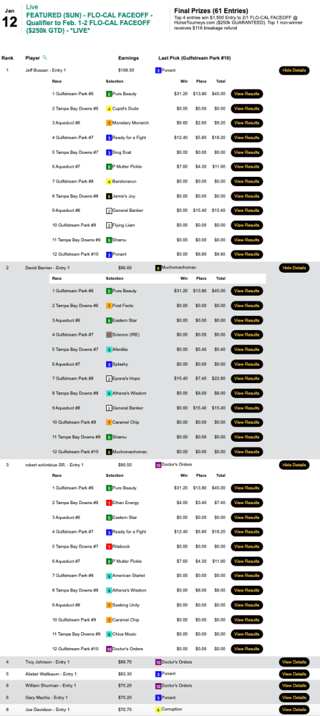 Yohler showed the way in Saturday’s Pegasus World Cup Betting Championship qualifier. Also picking up a $6,500 package for a week from Saturday was second-place finisher David Guberman (6W, 1P). Bernietakescharge was Guberman’s primary springboard to success.