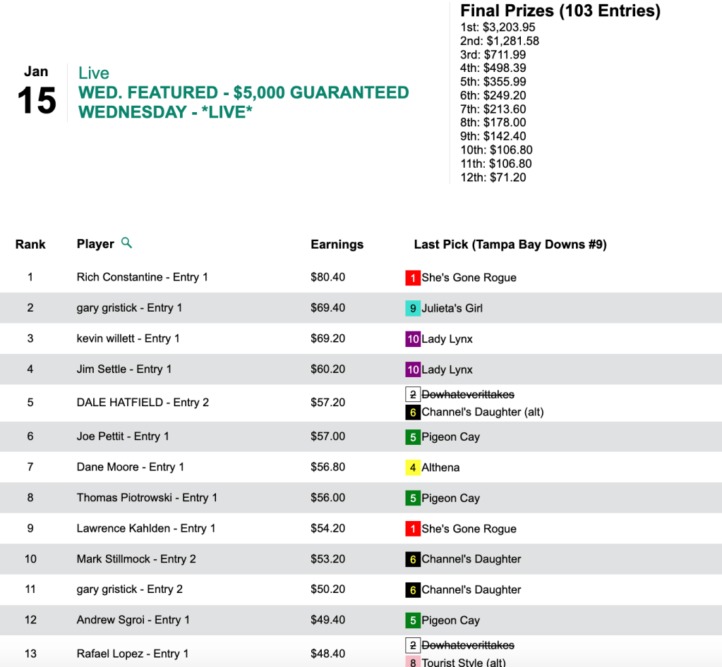 That’s the amount that Constantine (3 wins, 2 places) collected for taking Wednesday’s $5,000 Guaranteed cash tourney, which closed with a final purse of $7,119. His top return came courtesy of Eddie W ($21.80, $8.20) in the 9th at Parx.