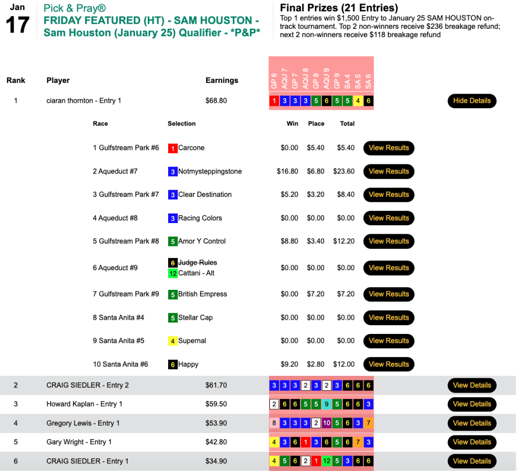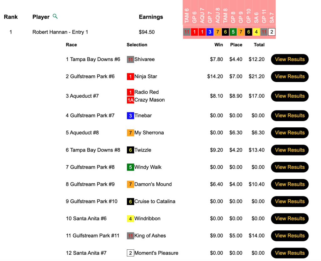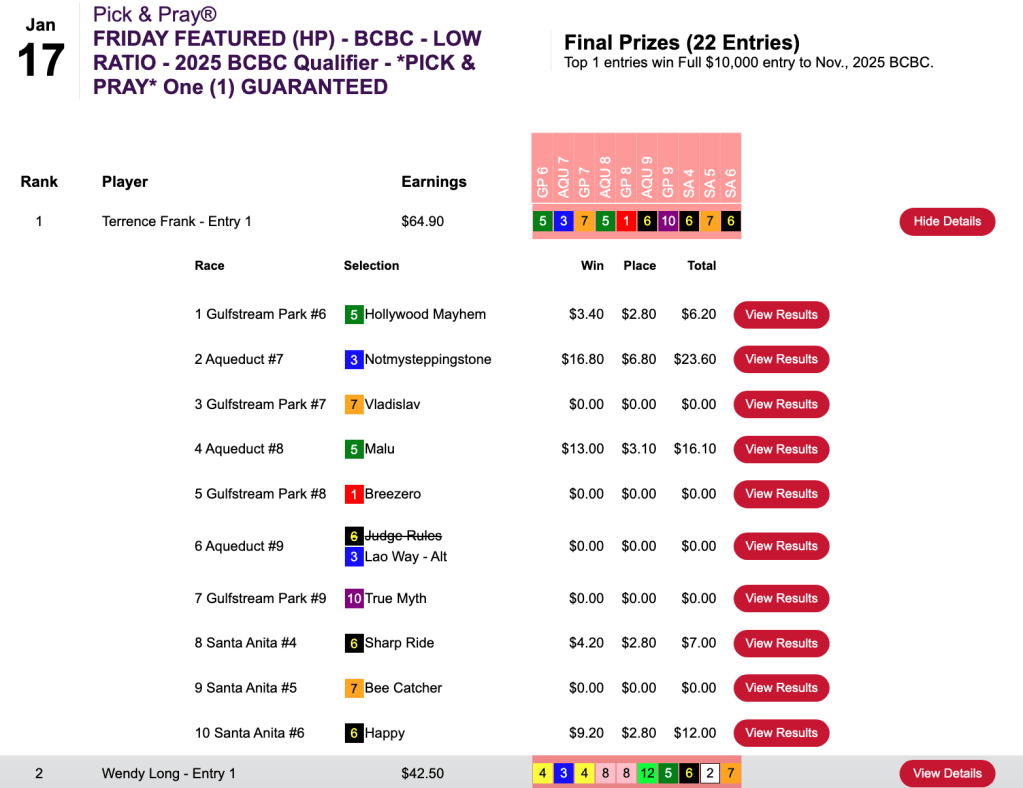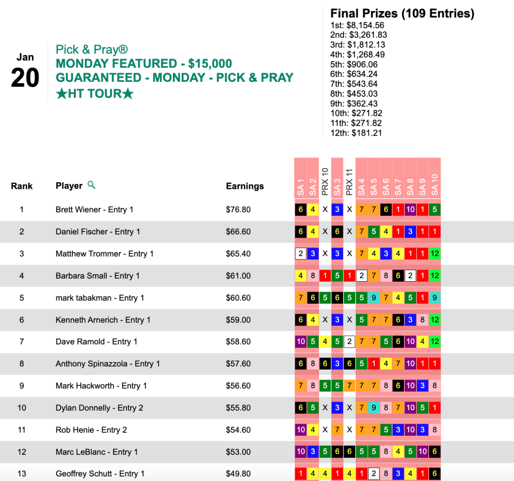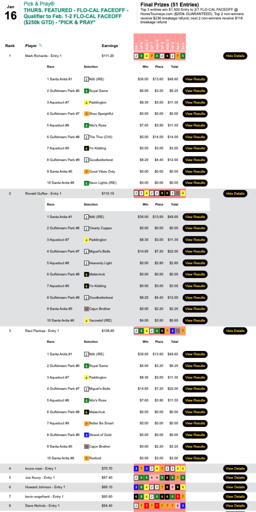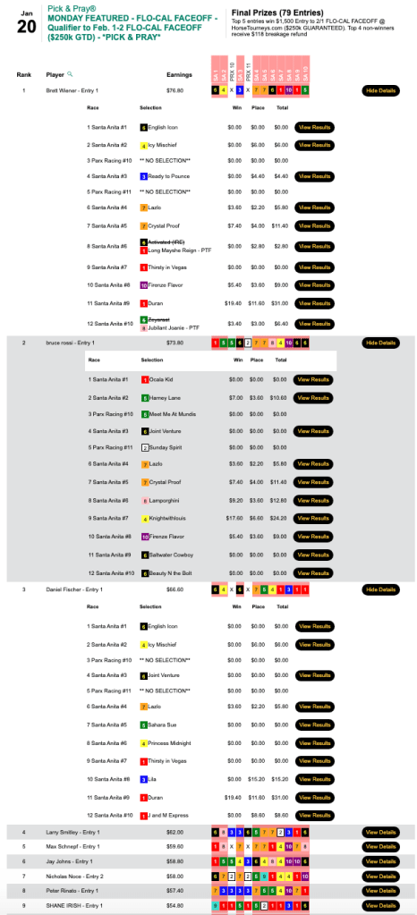 Santa Anita was the only one of our scheduled tracks with warm enough weather to operate, and Wiener took advantage of that by having the day’s biggest-priced winner at The Great Race Place—Duran ($19.40, $11.60) in the 9th. Between Duran and Wiener’s 4 other winners and 3 runners up, it was “No mas” for his opposition in Monday’s $15,000 Gtd. Pick & Pray. Wiener raked in $8,154 in an HT Tour game that closed with a pot of $18,121.
