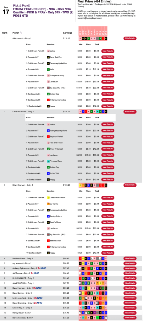 Whether you are an NHC rookie or an NHC fixture like Sally Goodall or David Stiles, the day in which you qualify for a given year’s NHC is always special. And so it was for Brandon Leigh (7 wins, 1 place), who swept the final four races and captured Saturday’s NHC qualifier at HorsePlayers—a game restricted to those who had yet to nail down a 2025 seat.