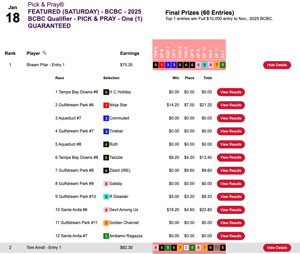 The same picks also landed Satyan on top of the leaderboard in Friday’s Pegasus World Cup Betting Championship qualifier.
