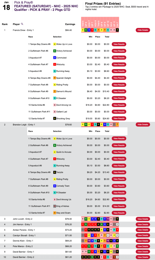 That is, of course, no knock on Goodall or Stiles (each an NHC Hall of Famer). In fact, NTRA rules make it close to impossible to do so, since you can win no more than one seat in any given qualifier. However, there is no rule against winning seats in two different qualifiers in one day—and that’s certainly easier to do online on one set of races, as Leigh did by virtue of finishing second to Francis Drew (6 wins, 1 place) in Saturday’s open, $210 NHC play-in at HorsePlayers.