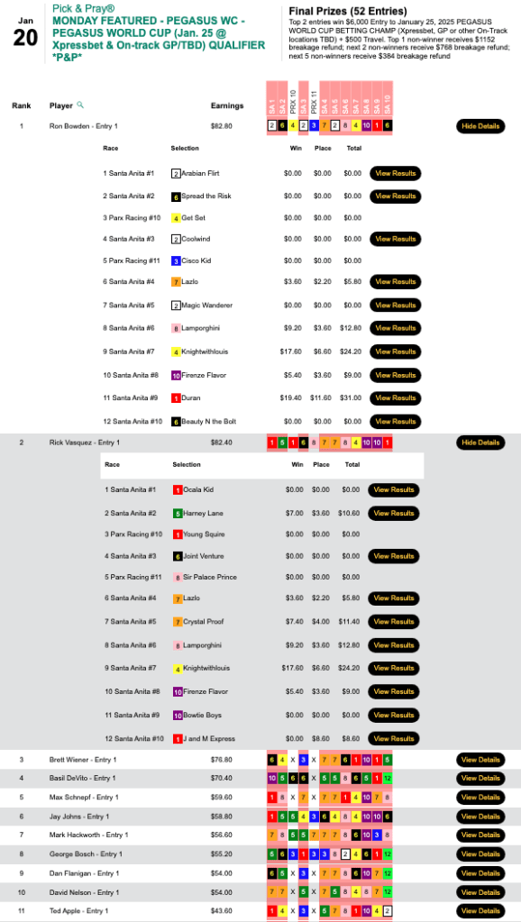 Time’s running out to win places in this Saturday’s Pegasus World Cup Betting Championship, but Ron Bowden and Rick Vasquez both got in under the deadline.