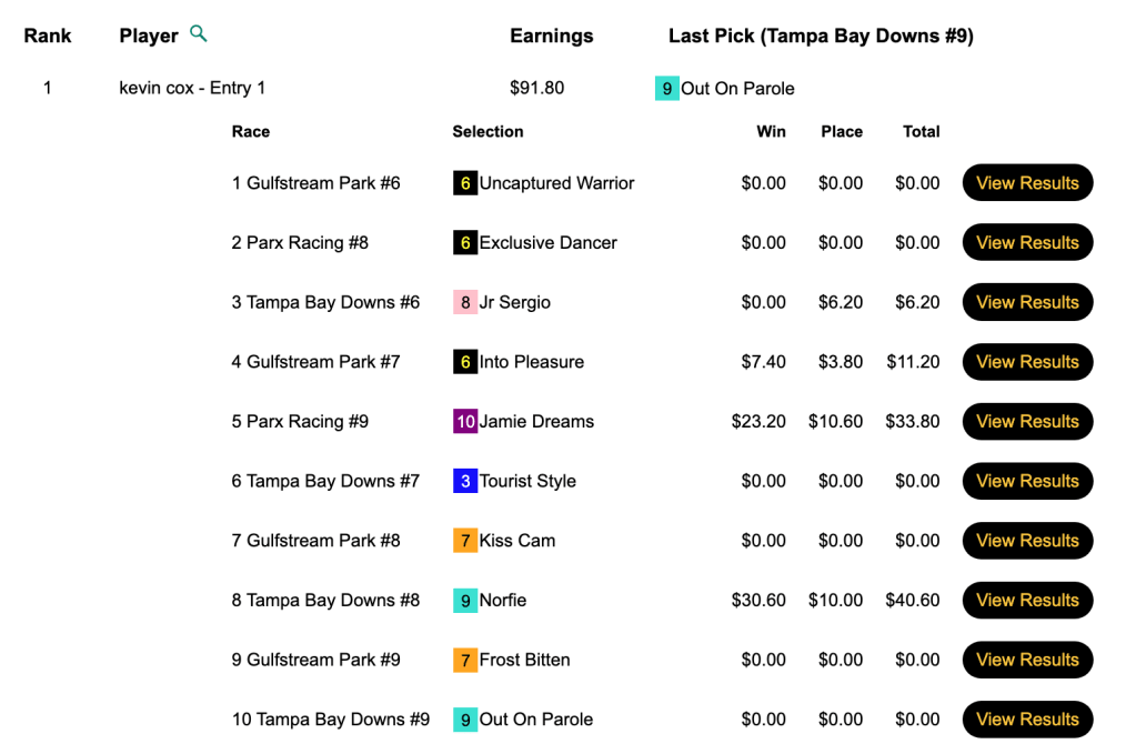 Cox collected the $3,266 grand prize in Wednesday’s $5,000 Guaranteed cash tourney, which ultimately paid out a total of $8,156. The star of his stable was Norfie ($30.60, $10.00) in race 8 at Tampa Bay Downs.