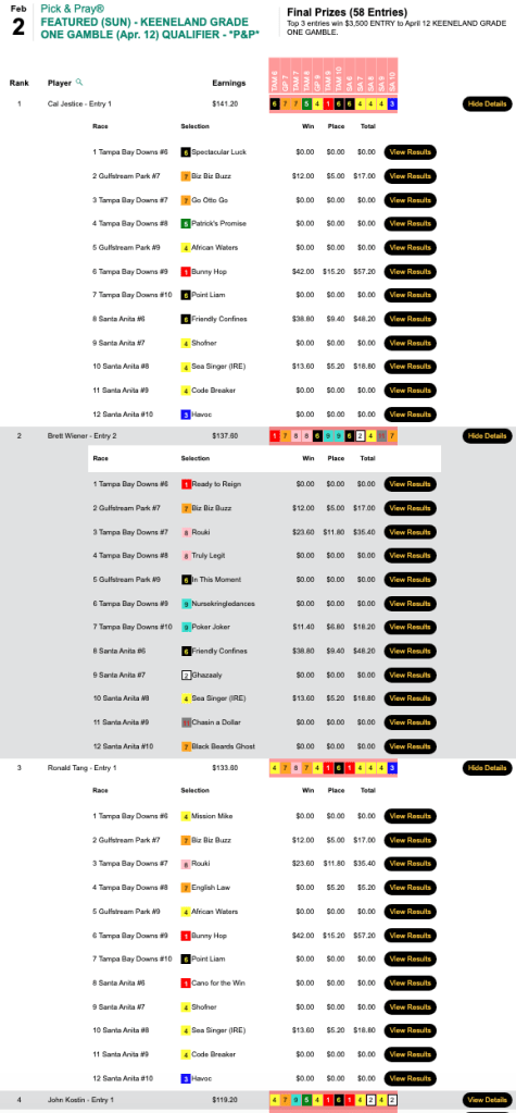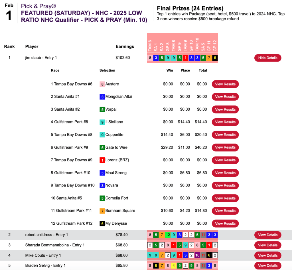 Defending NHC Champ Mike Gillum ($5,631), Kenneth Mollicone and Shad Walton were the other Sunday Day-bonus earners. That trio, along with Leibrock, all finished strong with 15-1 Ghostly Act in the finale at Santa Anita.