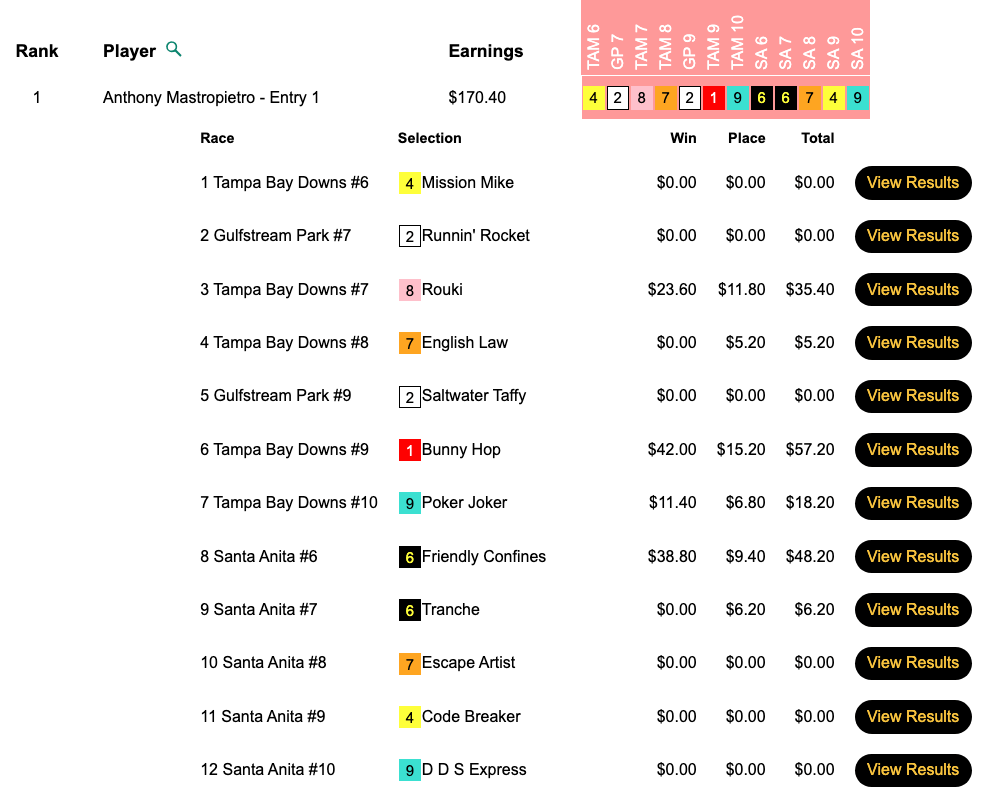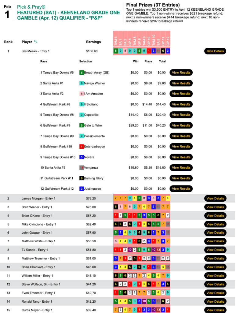 We had a Keeneland Grade One Gamble qualifier on Friday. The $3,500 seat winners were Adam Lewis (4 wins, 1 place) and Matthew Kosco (3W, 5P).