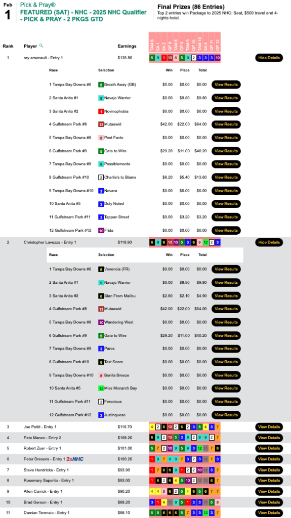 He had 32-1 Mutaawid in that 8th race en route to capturing Sautrday’s other HT Tour event, our $15,000 Guaranteed Pick & Pray, which closed with a purse of $25,564. The winner’s share for Lazarus came to $11,503.