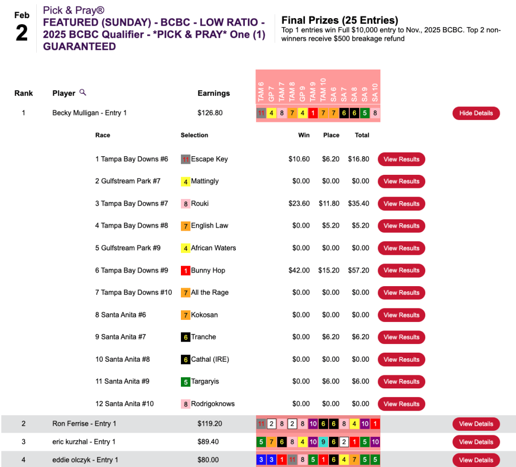 Mulligan recorded 3 firsts and 3 seconds during her winning performance in Sunday’s Breeders’ Cup Betting Challenge Low Ratio qualifier at HorsePlayers.