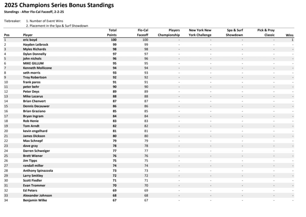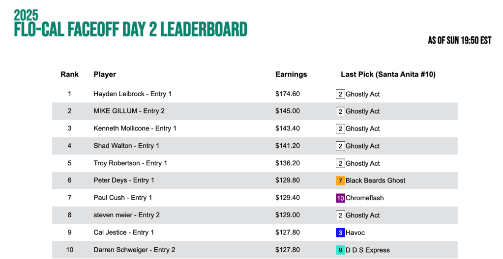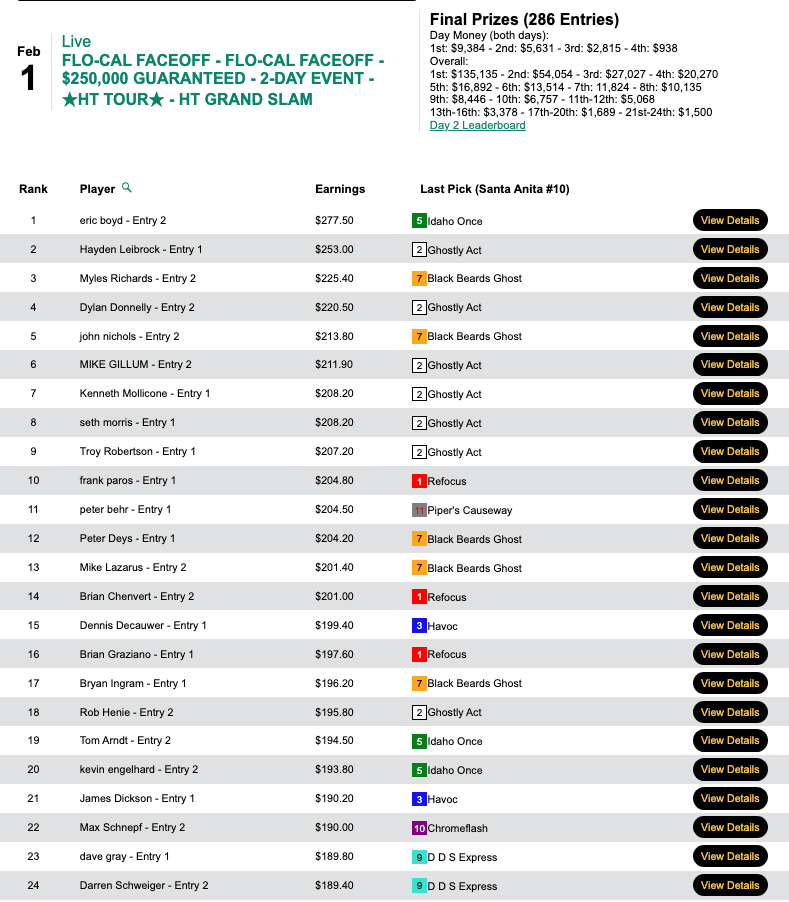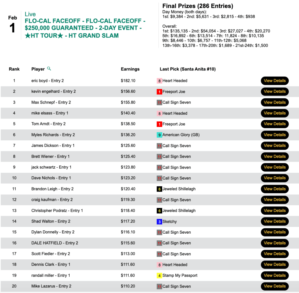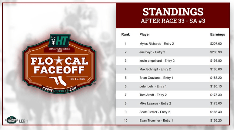 Boyd received $135,135 for doing best across the two days plus a $9,384 “Day money” bonus for having the best score on Saturday’s first day of competition. In the Flo-Cal Faceoff Boyd played two entries (the maximum permitted). One of those entries he received for free by virtue of his 2024 HorseTourneys Tour championship. That accomplishment earned him a $20,000 cash prize along with paid entries into all five contests that comprise the 2025 HorseTourneys Champions Series.