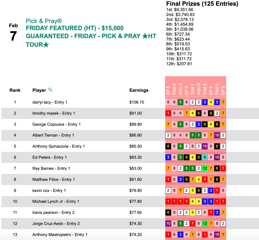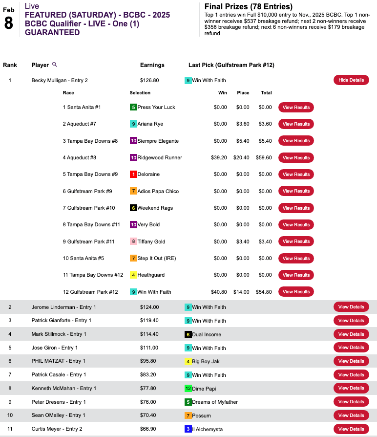 Lacy picked three winners on Saturday. In the win hole, they returned $52.00, $39.20 and $27.20. The best of the bunch was Petite Treat ($52.00, $13.20) in the opener at Santa Anita. Lacy’s gaudy trio brought him another big payday—this one worth $17,186—in our richest tourney of the week, our $25,000 Guaranteed game, which was ultimately worth a total of $38,192.