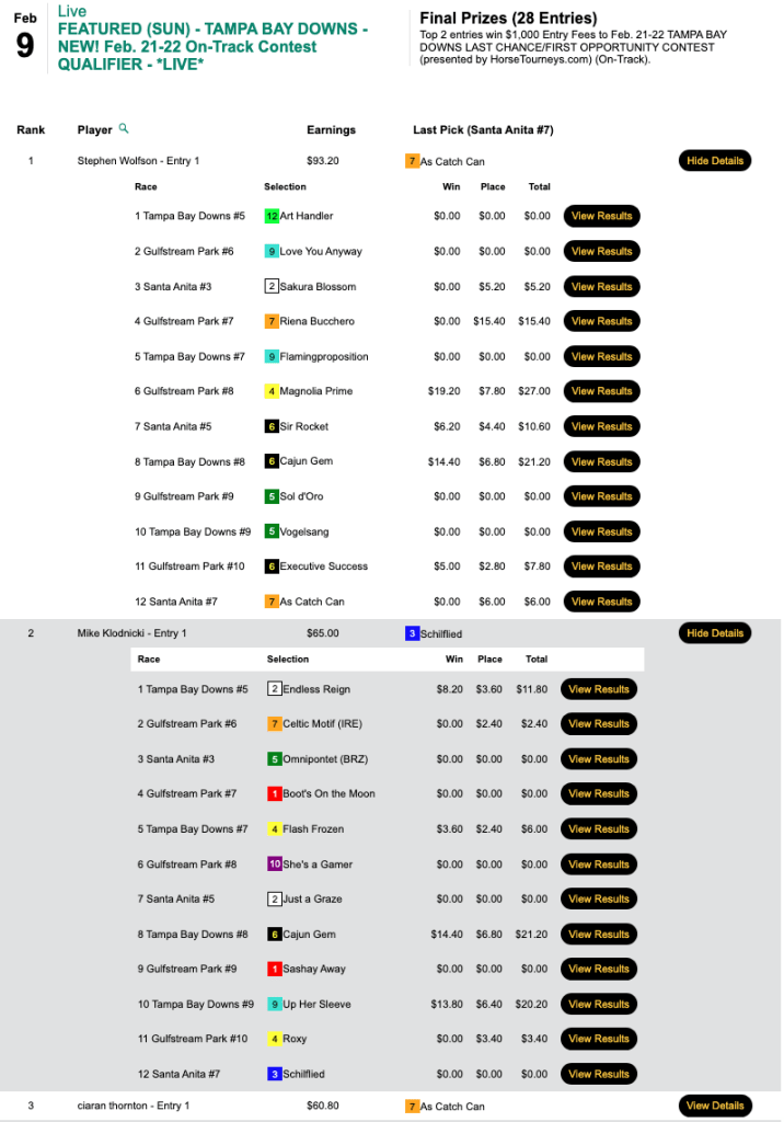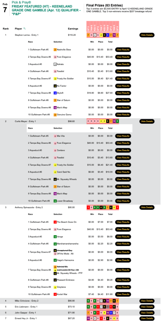 Back here at HorseTourneys, three players landed $3,500 entries in Friday’s play-in to the April 12 Keeneland Grade One Gamble.